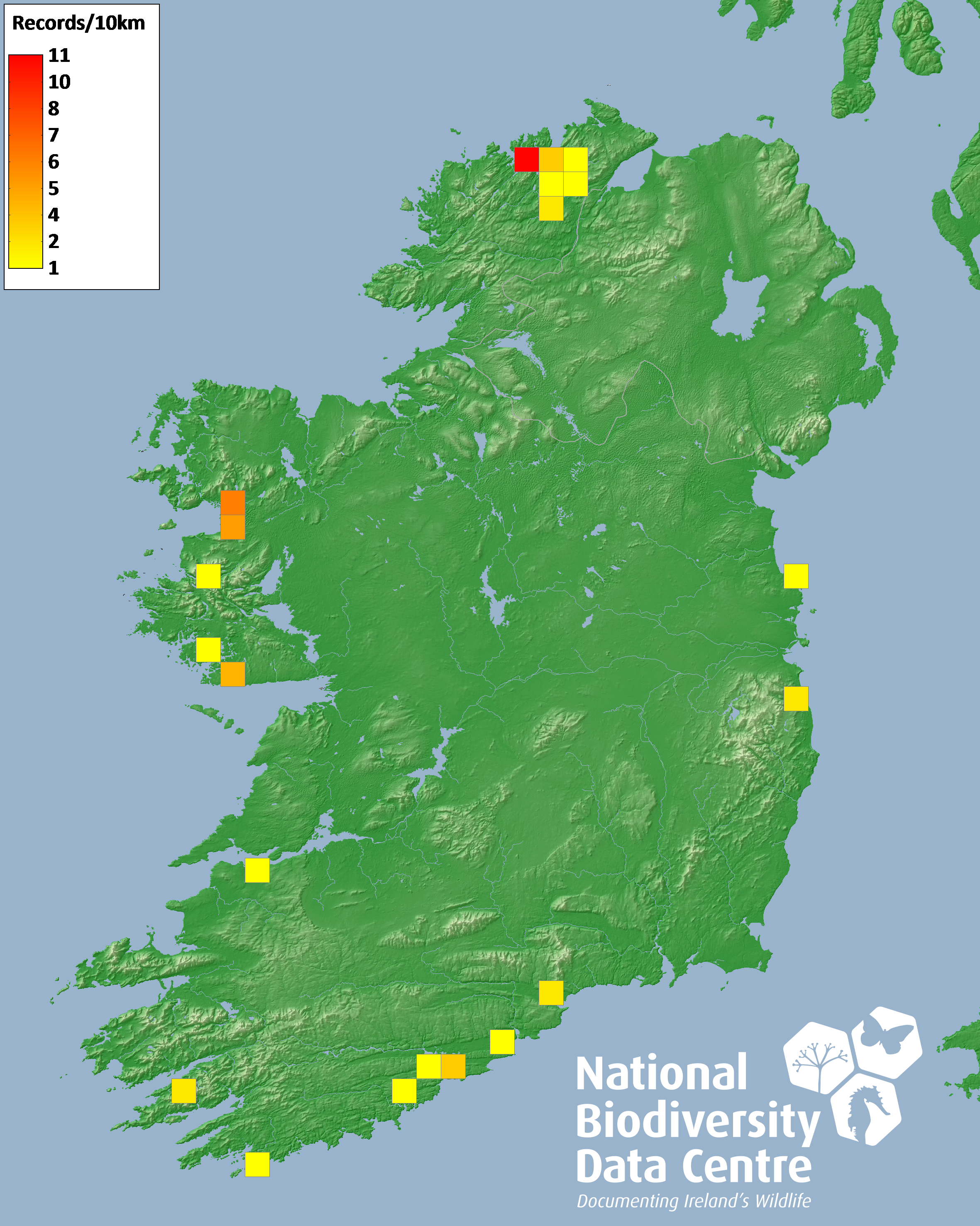 Distribution of the number of records recorded within each 10km grid square (ITM).Marine Map - 50km