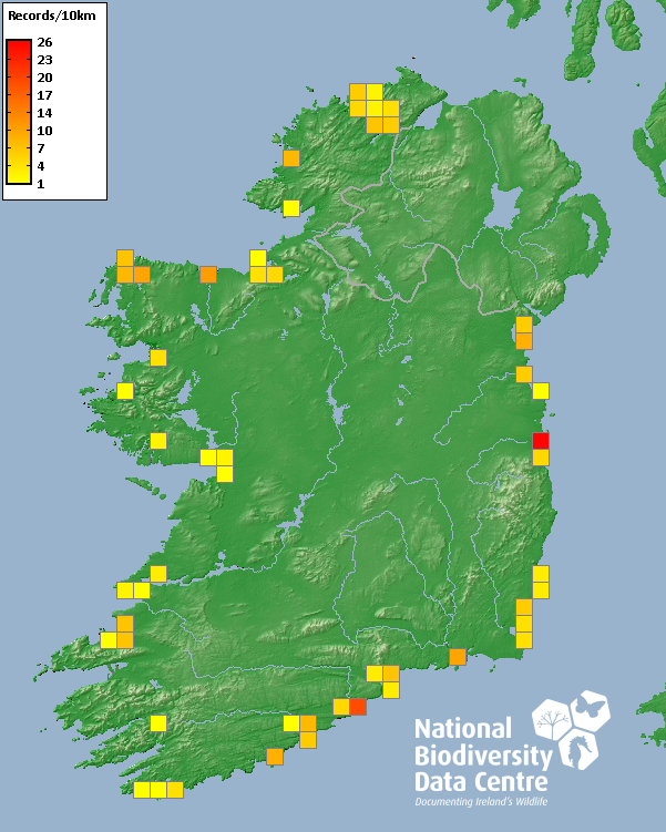 Distribution of the number of records recorded within each 10km grid square (ITM).Marine Map - 50km