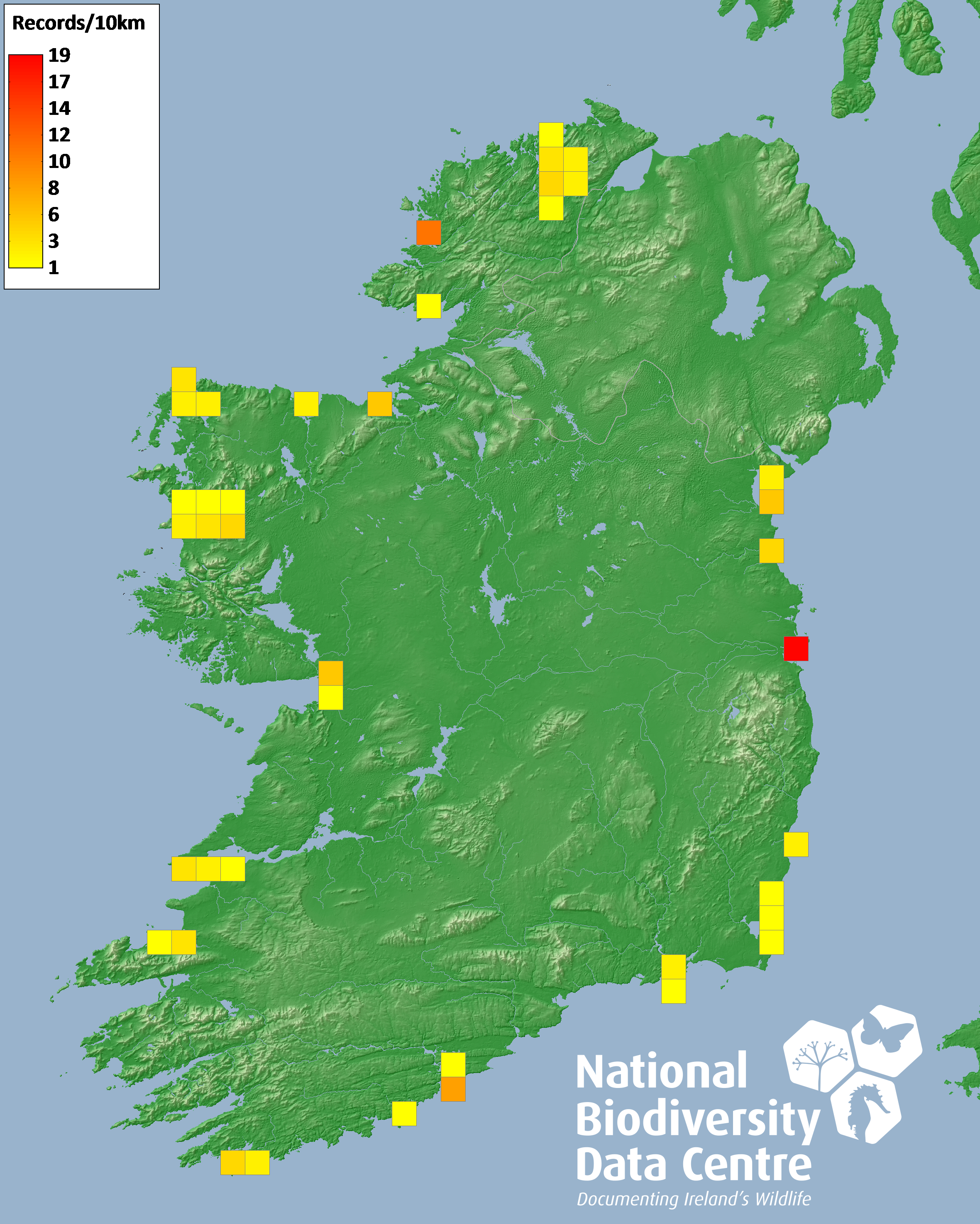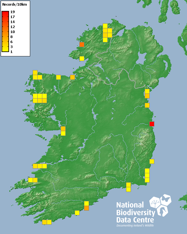Distribution of the number of records recorded within each 10km grid square (ITM).Marine Map - 50km
