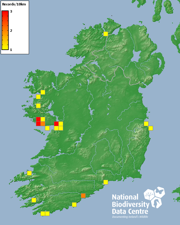 Distribution of the number of records recorded within each 10km grid square (ITM).Marine Map - 50km
