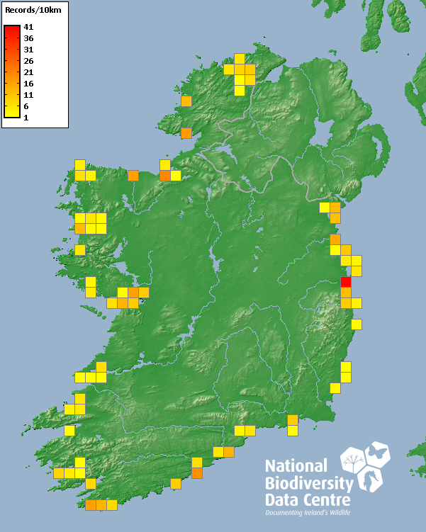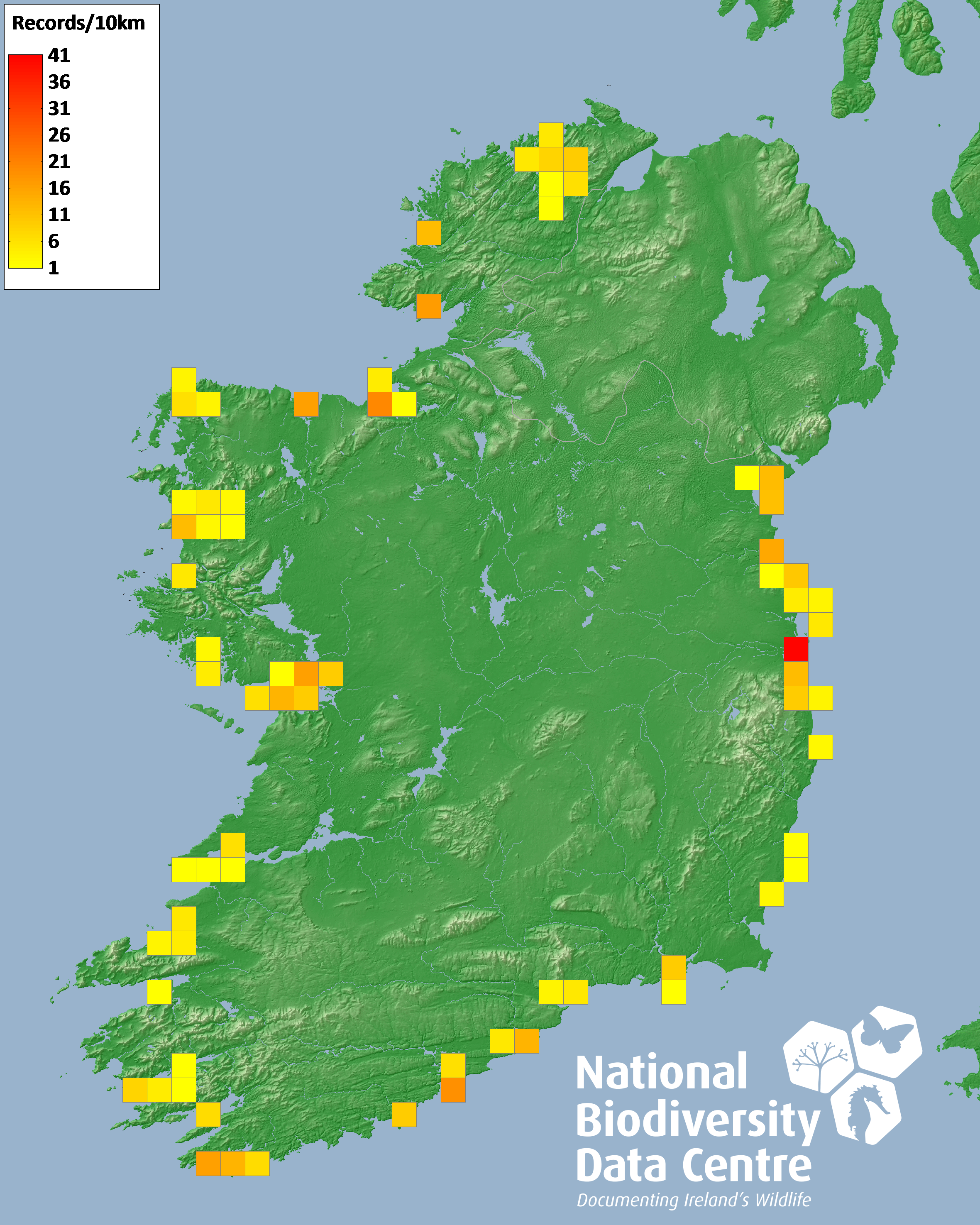 Distribution of the number of records recorded within each 10km grid square (ITM).Marine Map - 50km