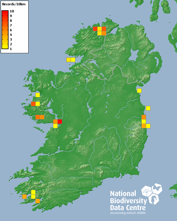Distribution of the number of records recorded within each 10km grid square (ITM).Marine Map - 50km