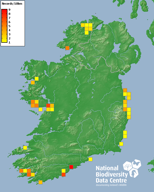 Distribution of the number of records recorded within each 10km grid square (ITM).Marine Map - 50km
