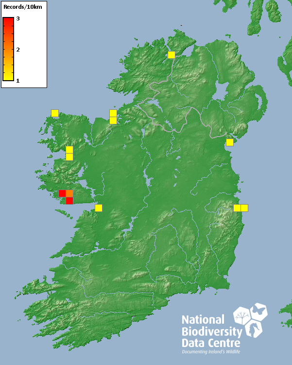 Distribution of the number of records recorded within each 10km grid square (ITM).Marine Map - 50km