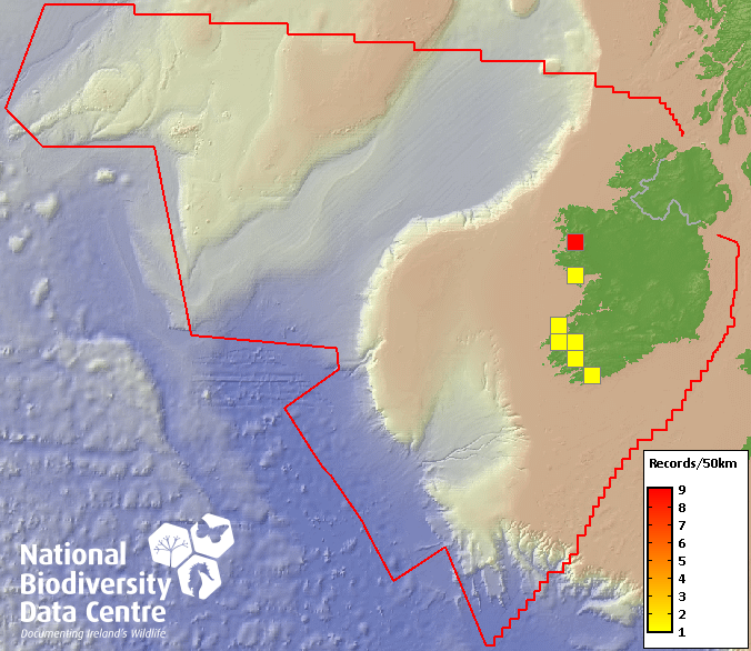Distribution of the number of records recorded within each 10km grid square (ITM).Marine Map - 50km