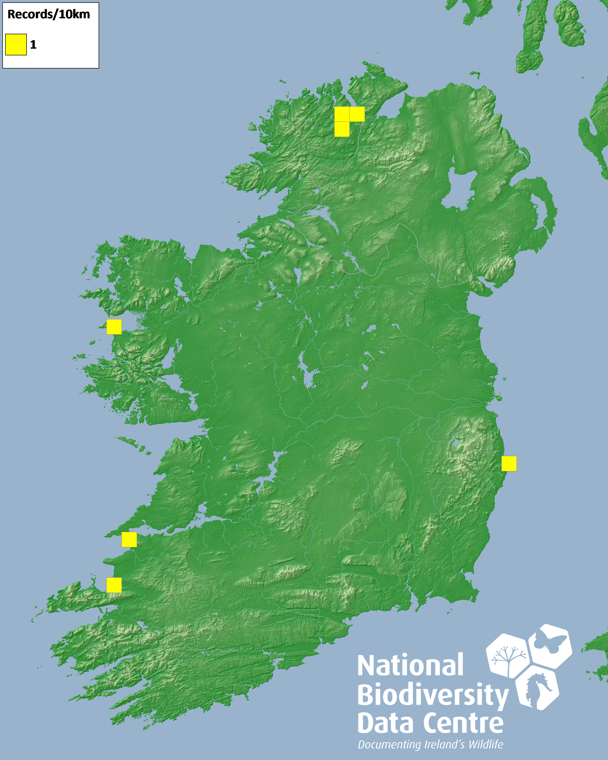 Distribution of the number of records recorded within each 10km grid square (ITM).Marine Map - 50km