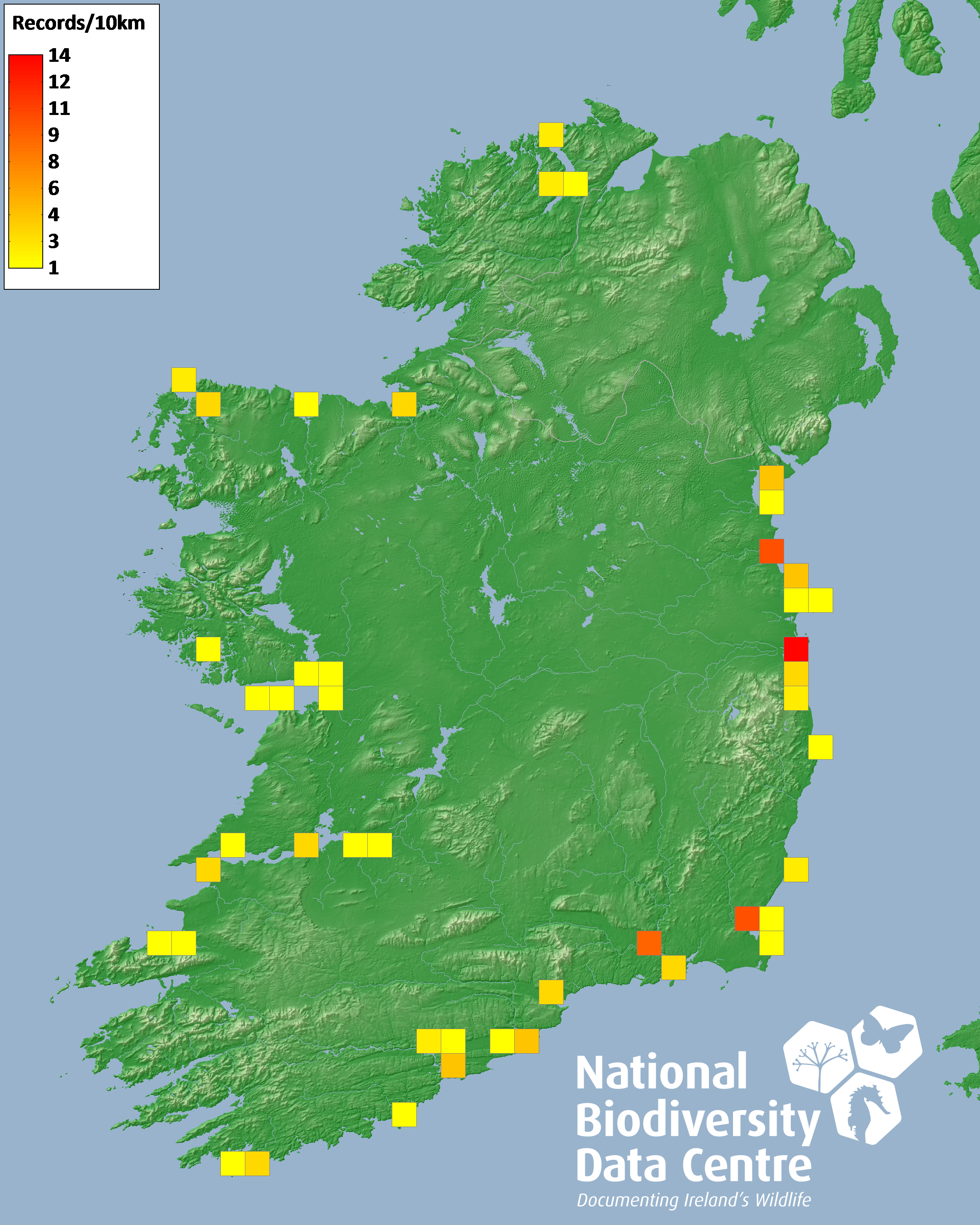 Distribution of the number of records recorded within each 10km grid square (ITM).Marine Map - 50km