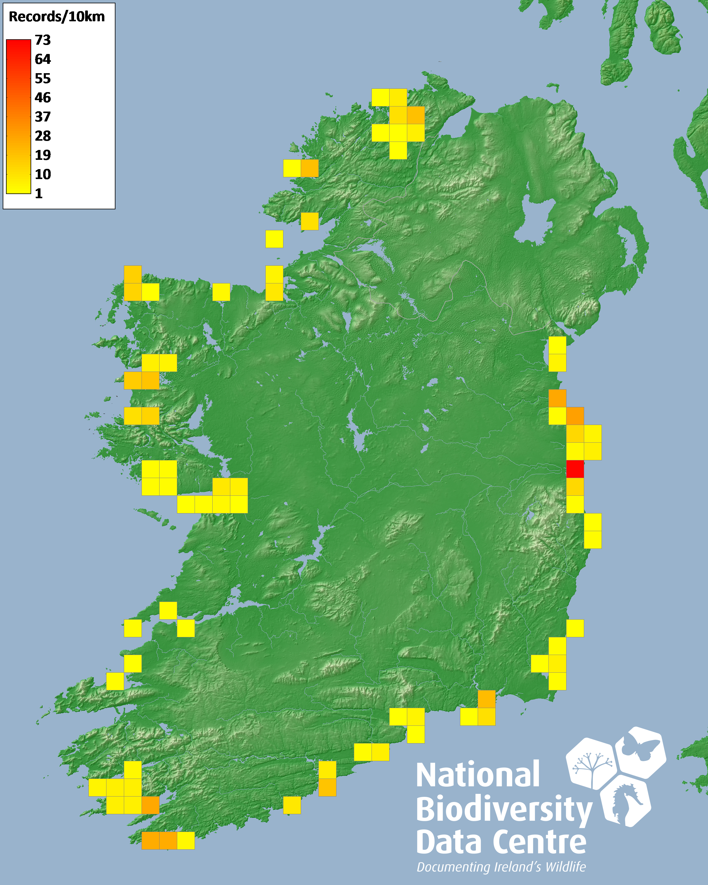 Distribution of the number of records recorded within each 10km grid square (ITM).Marine Map - 50km