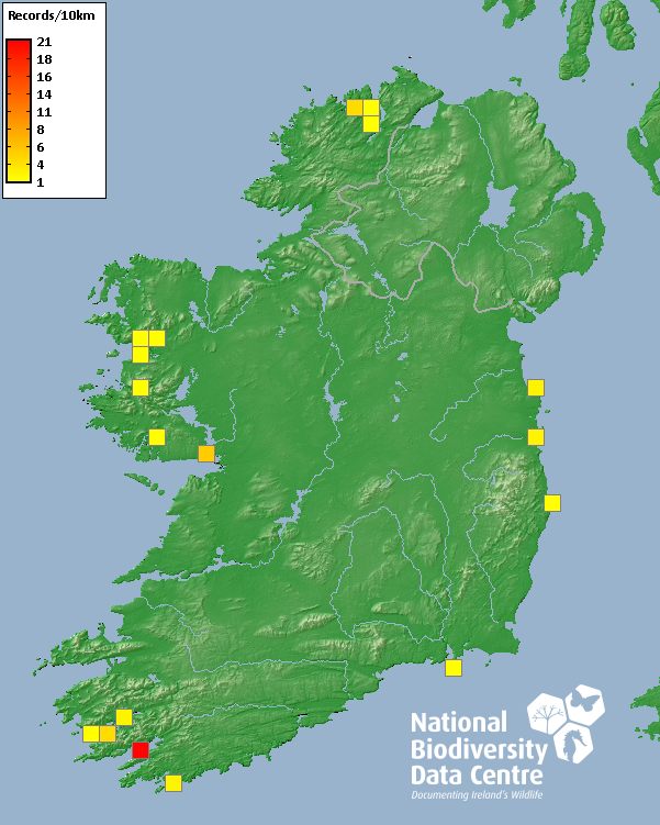 Distribution of the number of records recorded within each 10km grid square (ITM).Marine Map - 50km