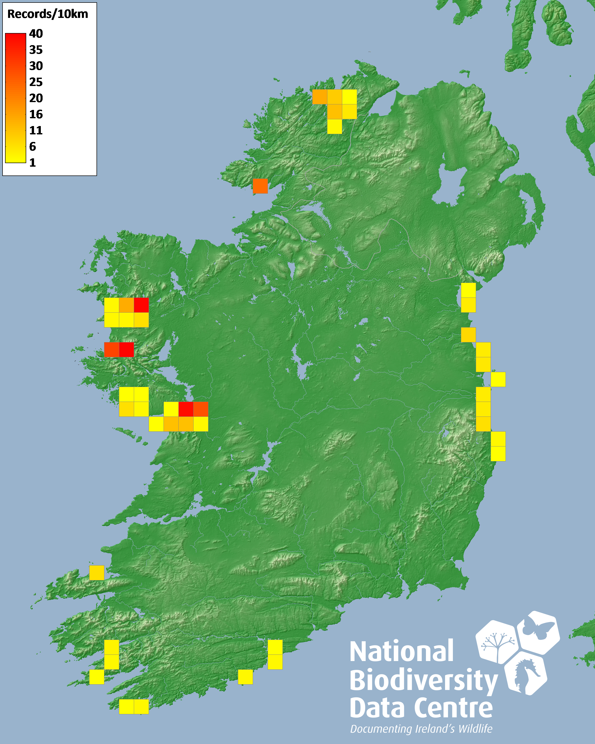 Distribution of the number of records recorded within each 10km grid square (ITM).Marine Map - 50km