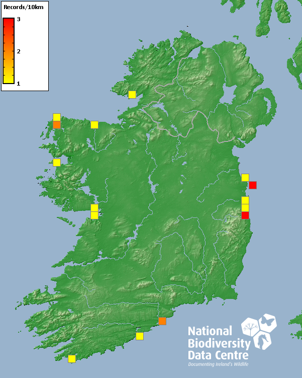 Distribution of the number of records recorded within each 10km grid square (ITM).Marine Map - 50km