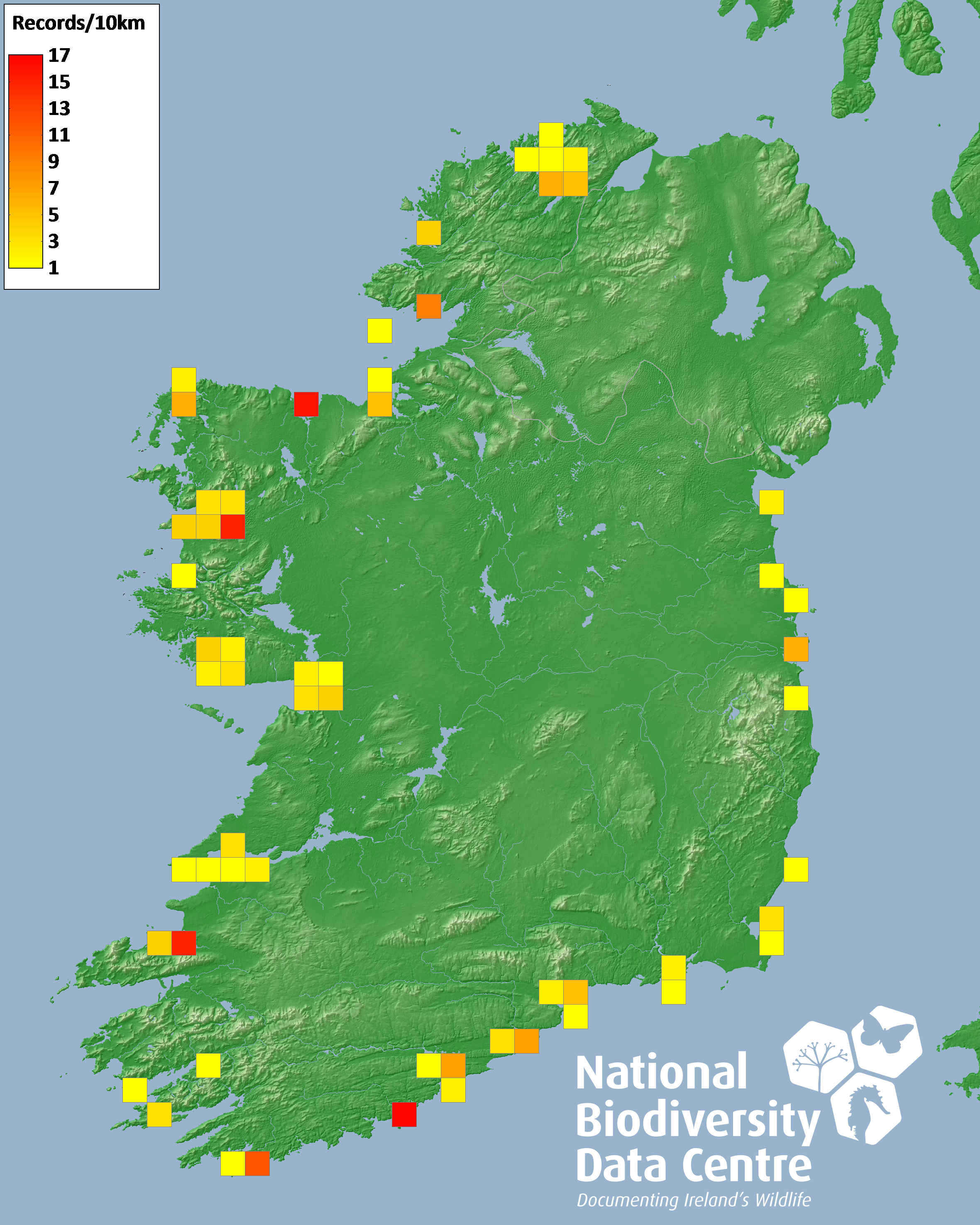 Distribution of the number of records recorded within each 10km grid square (ITM).Marine Map - 50km