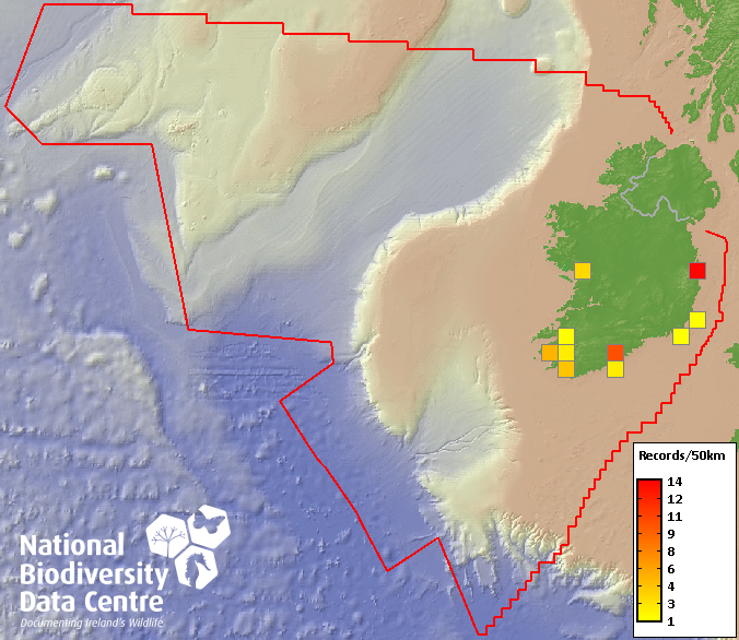 Distribution of the number of records recorded within each 10km grid square (ITM).Marine Map - 50km