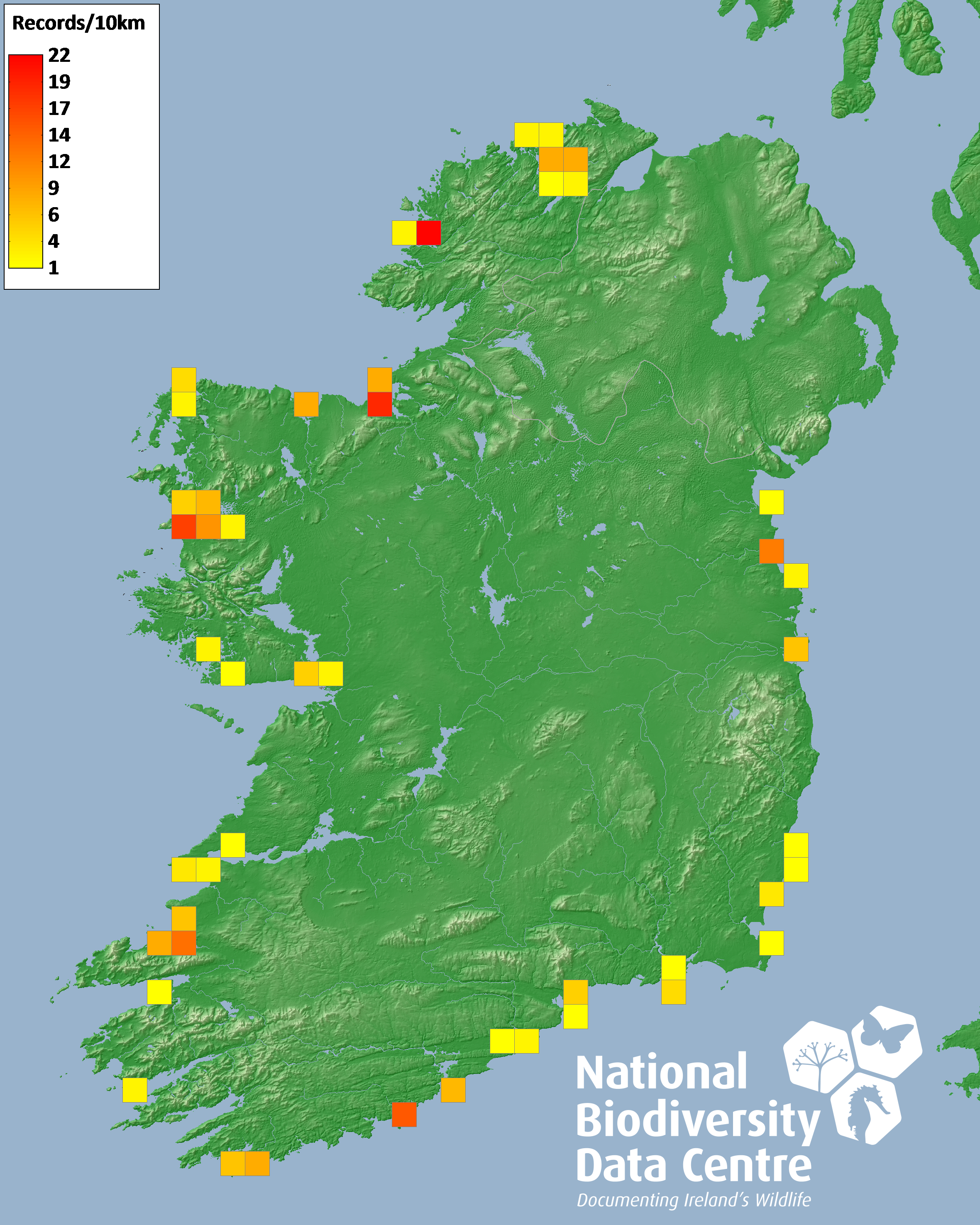 Distribution of the number of records recorded within each 10km grid square (ITM).Marine Map - 50km