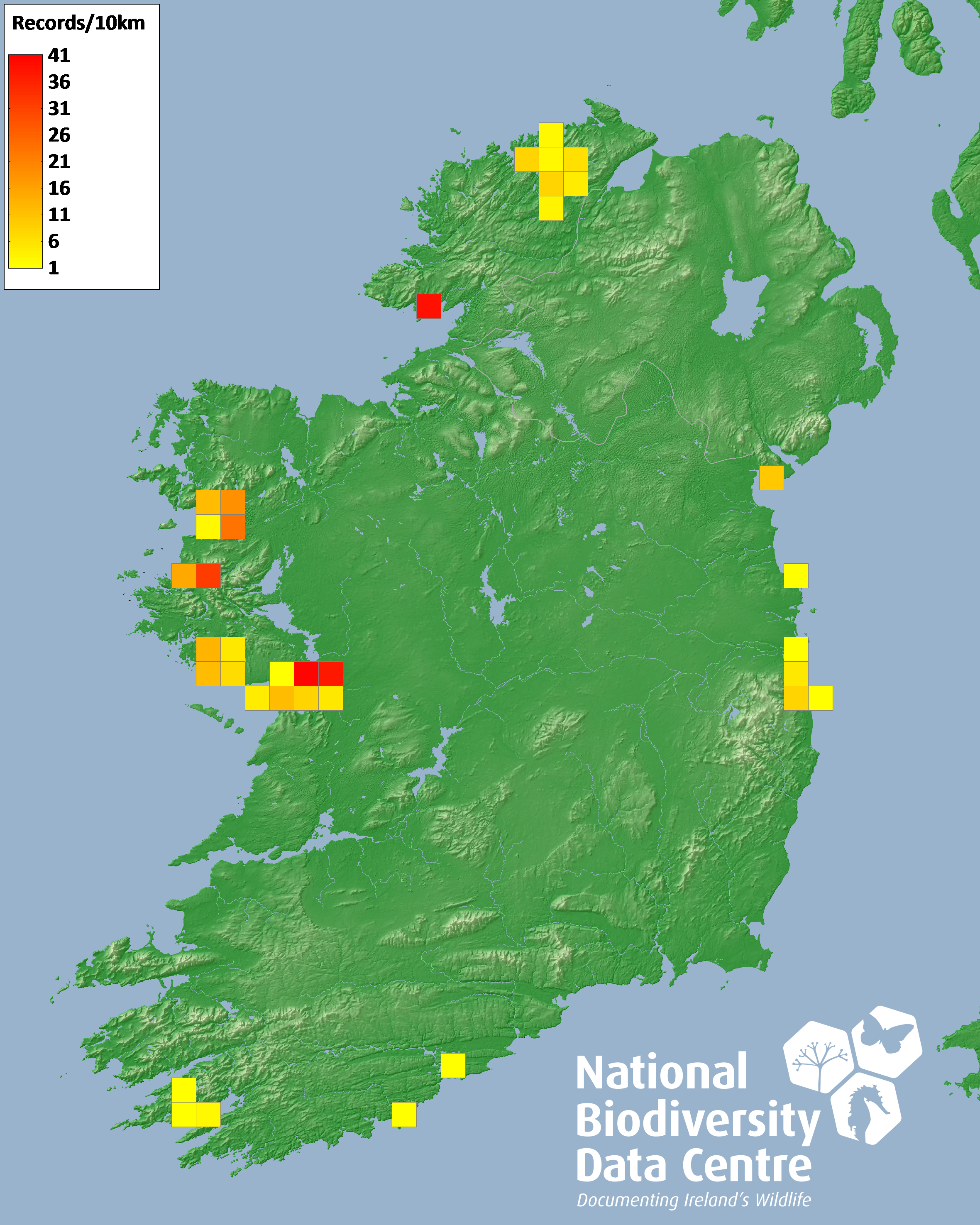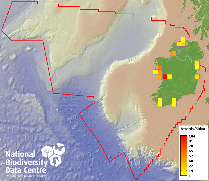 Distribution of the number of records recorded within each 10km grid square (ITM).Marine Map - 50km