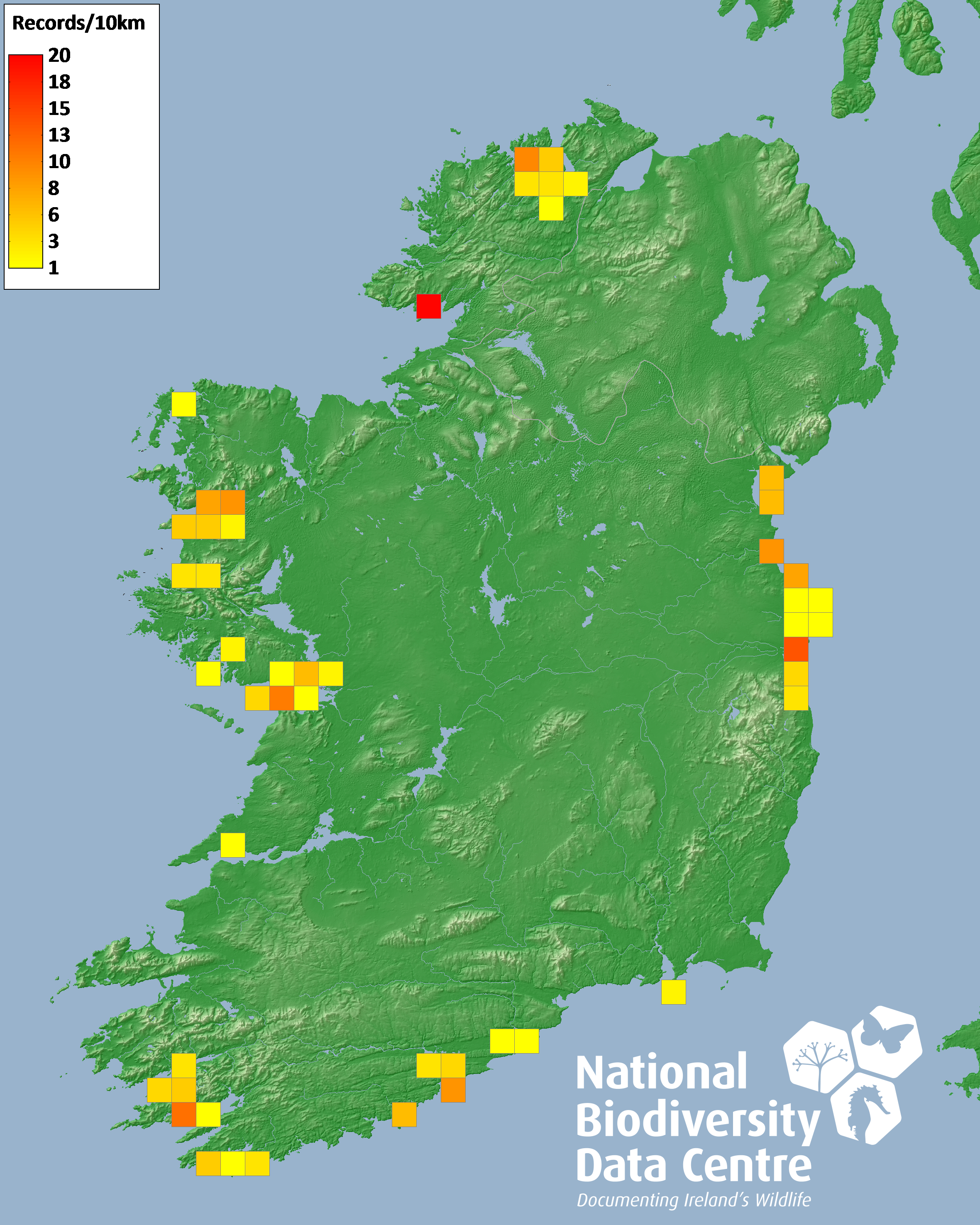 Distribution of the number of records recorded within each 10km grid square (ITM).Marine Map - 50km