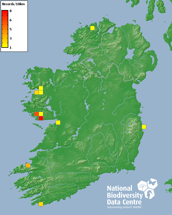 Distribution of the number of records recorded within each 10km grid square (ITM).Marine Map - 50km