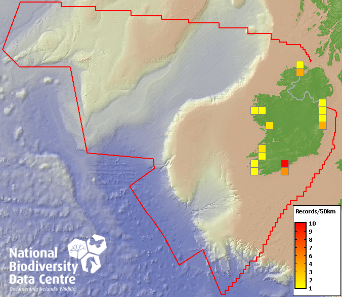 Distribution of the number of records recorded within each 10km grid square (ITM).Marine Map - 50km