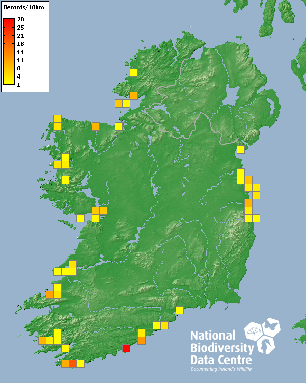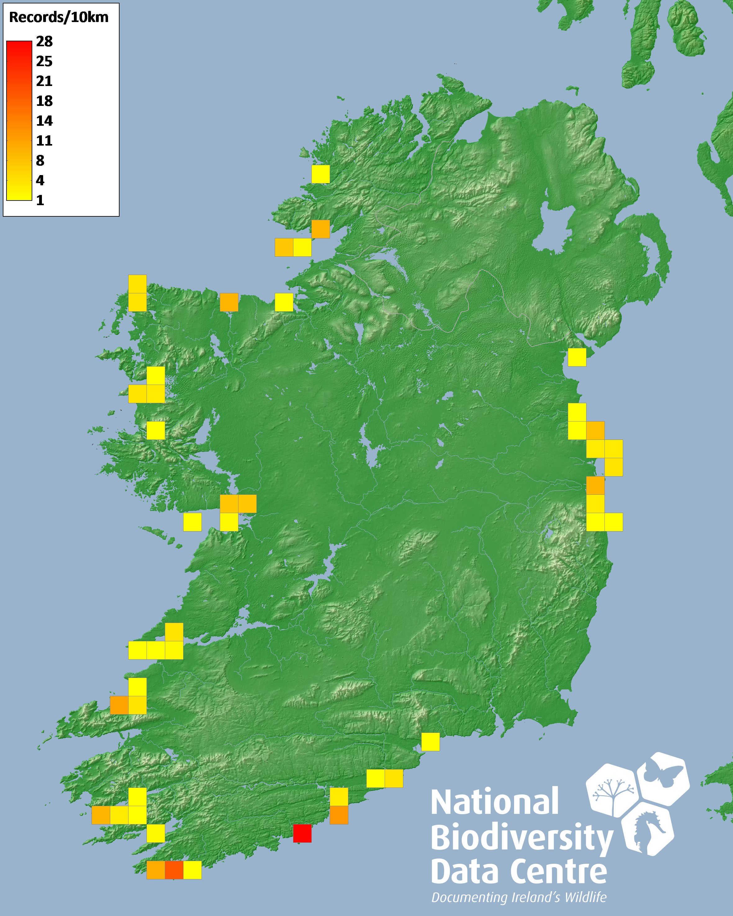 Distribution of the number of records recorded within each 10km grid square (ITM).Marine Map - 50km