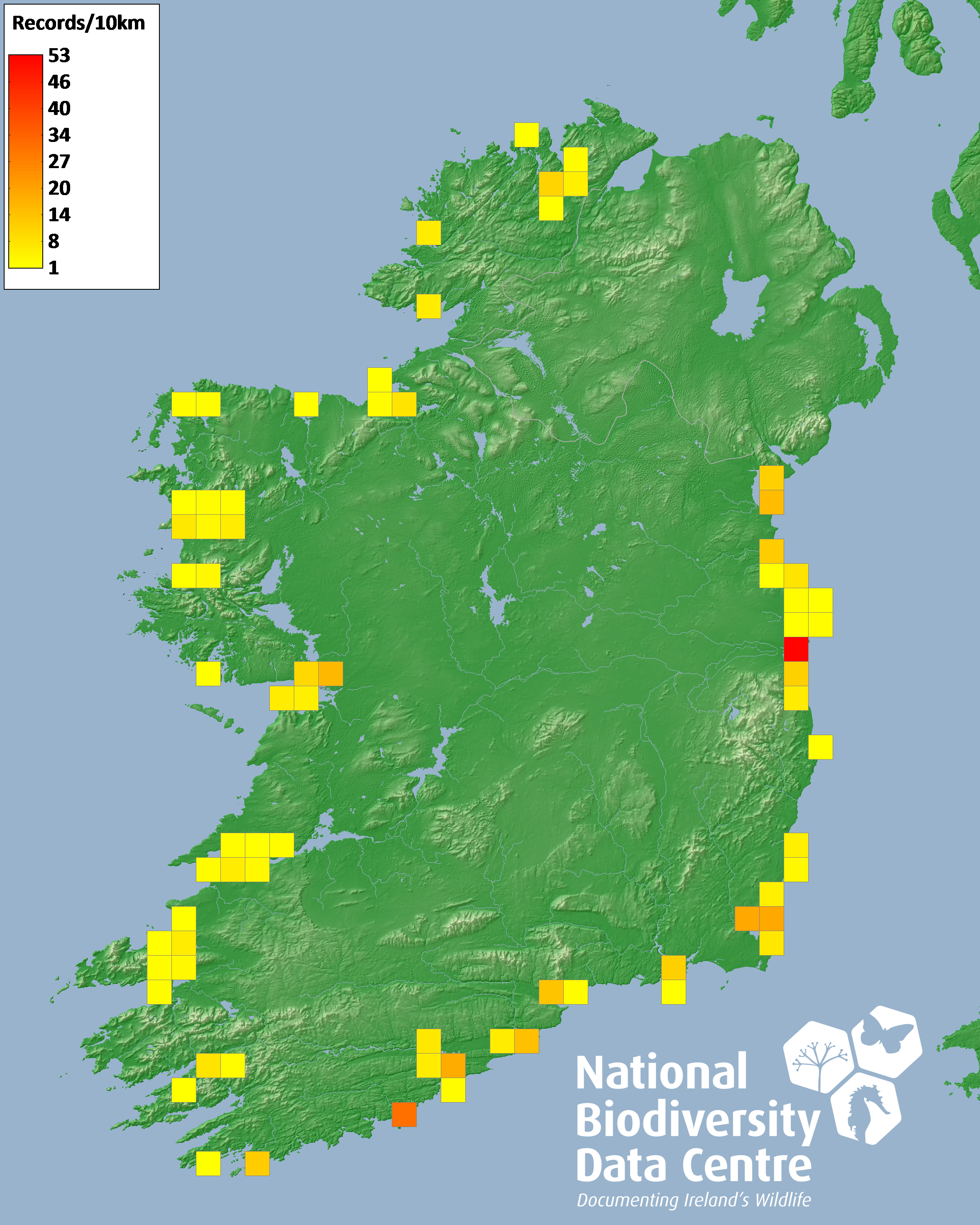 Distribution of the number of records recorded within each 10km grid square (ITM).Marine Map - 50km