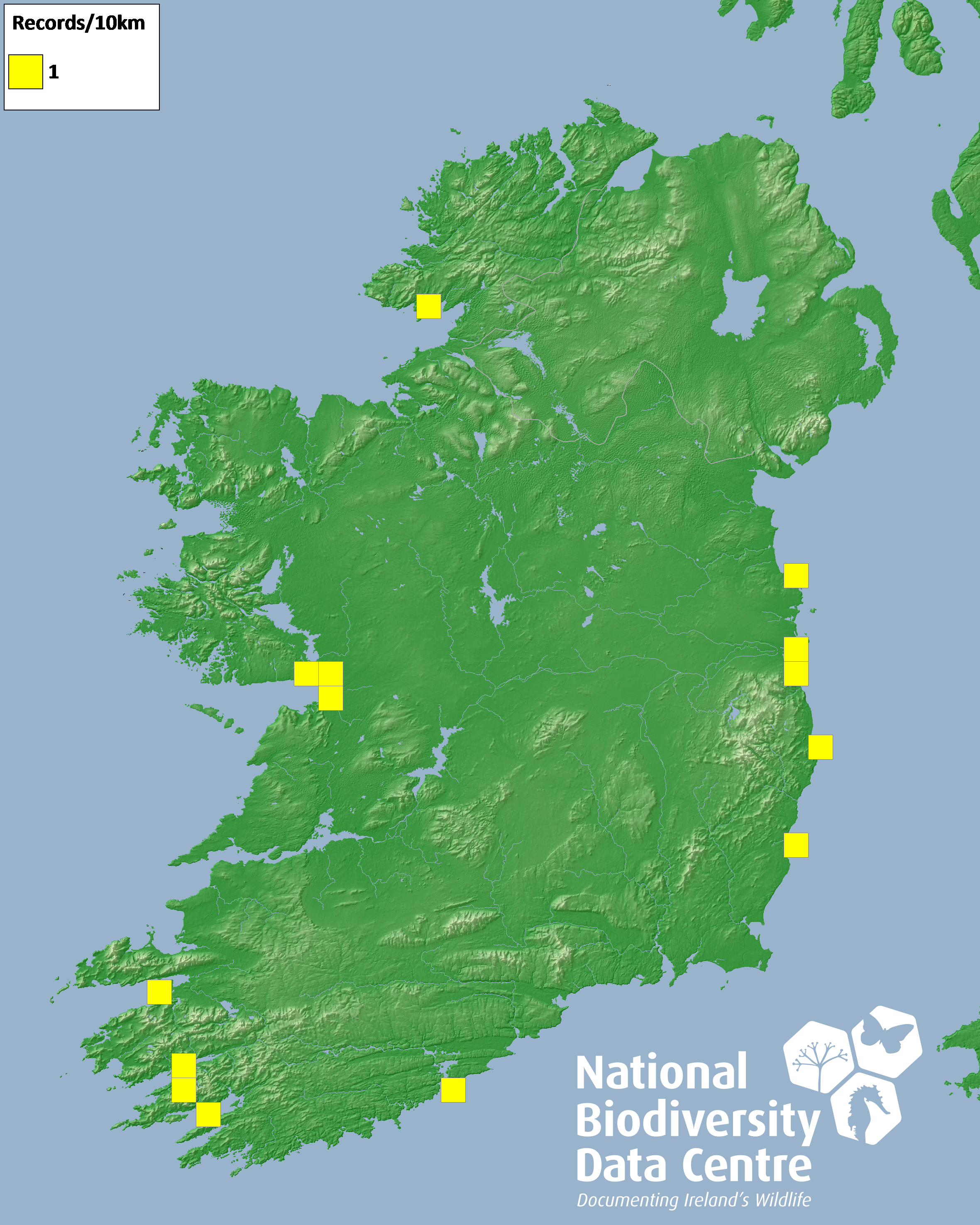 Distribution of the number of records recorded within each 10km grid square (ITM).Marine Map - 50km