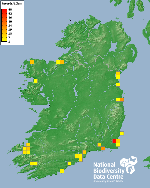 Distribution of the number of records recorded within each 10km grid square (ITM).Marine Map - 50km
