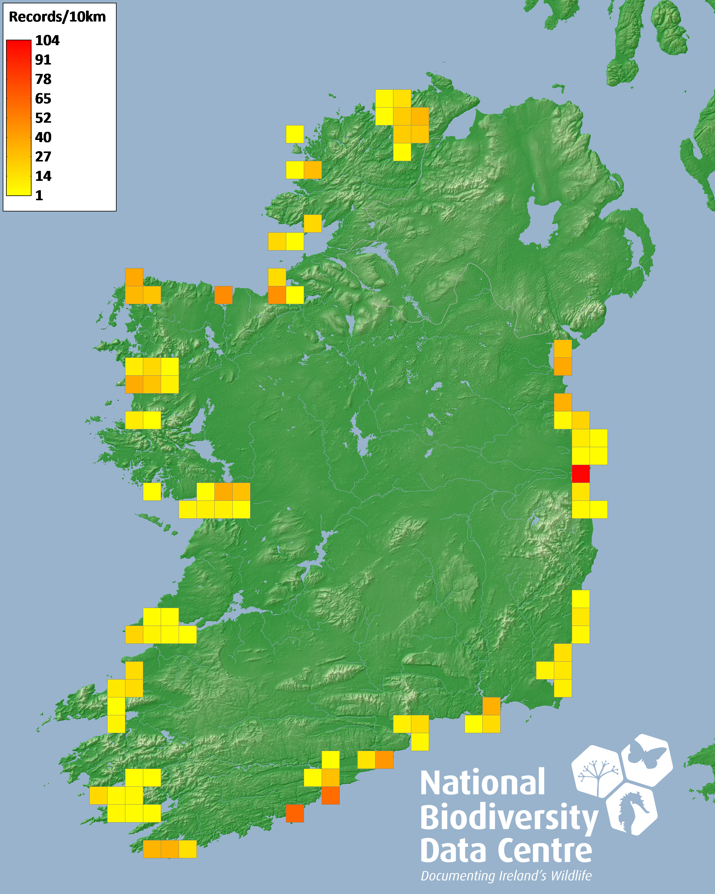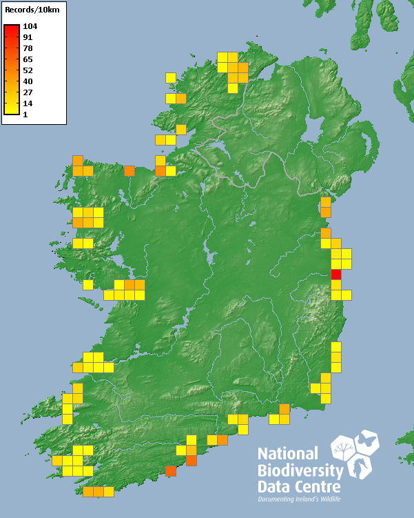 Distribution of the number of records recorded within each 10km grid square (ITM).Marine Map - 50km