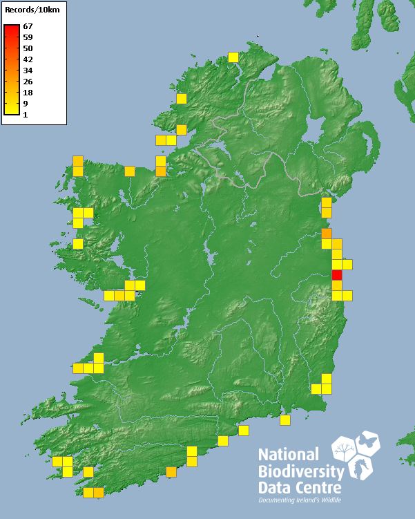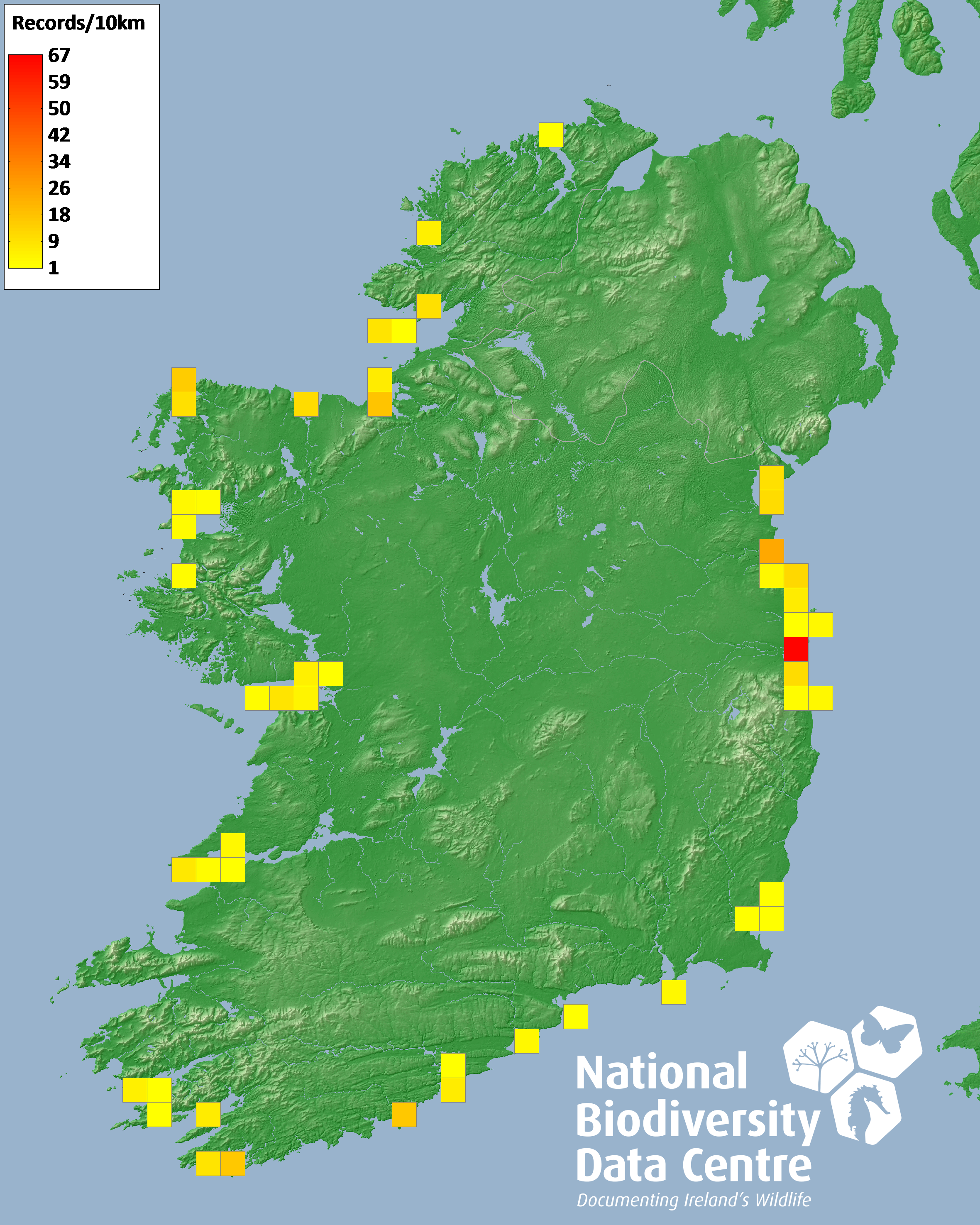 Distribution of the number of records recorded within each 10km grid square (ITM).Marine Map - 50km