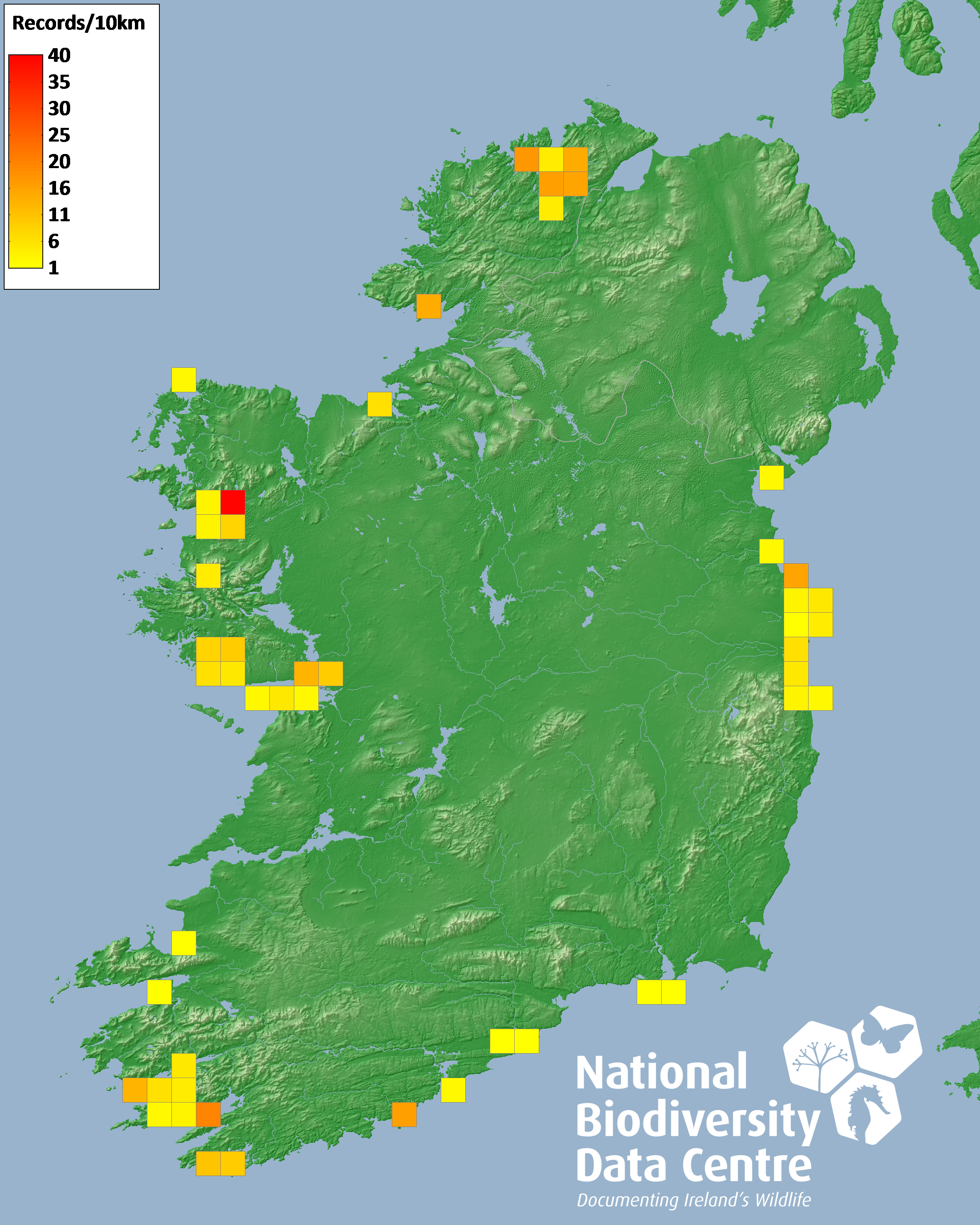 Distribution of the number of records recorded within each 10km grid square (ITM).Marine Map - 50km