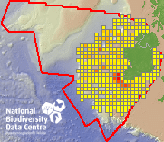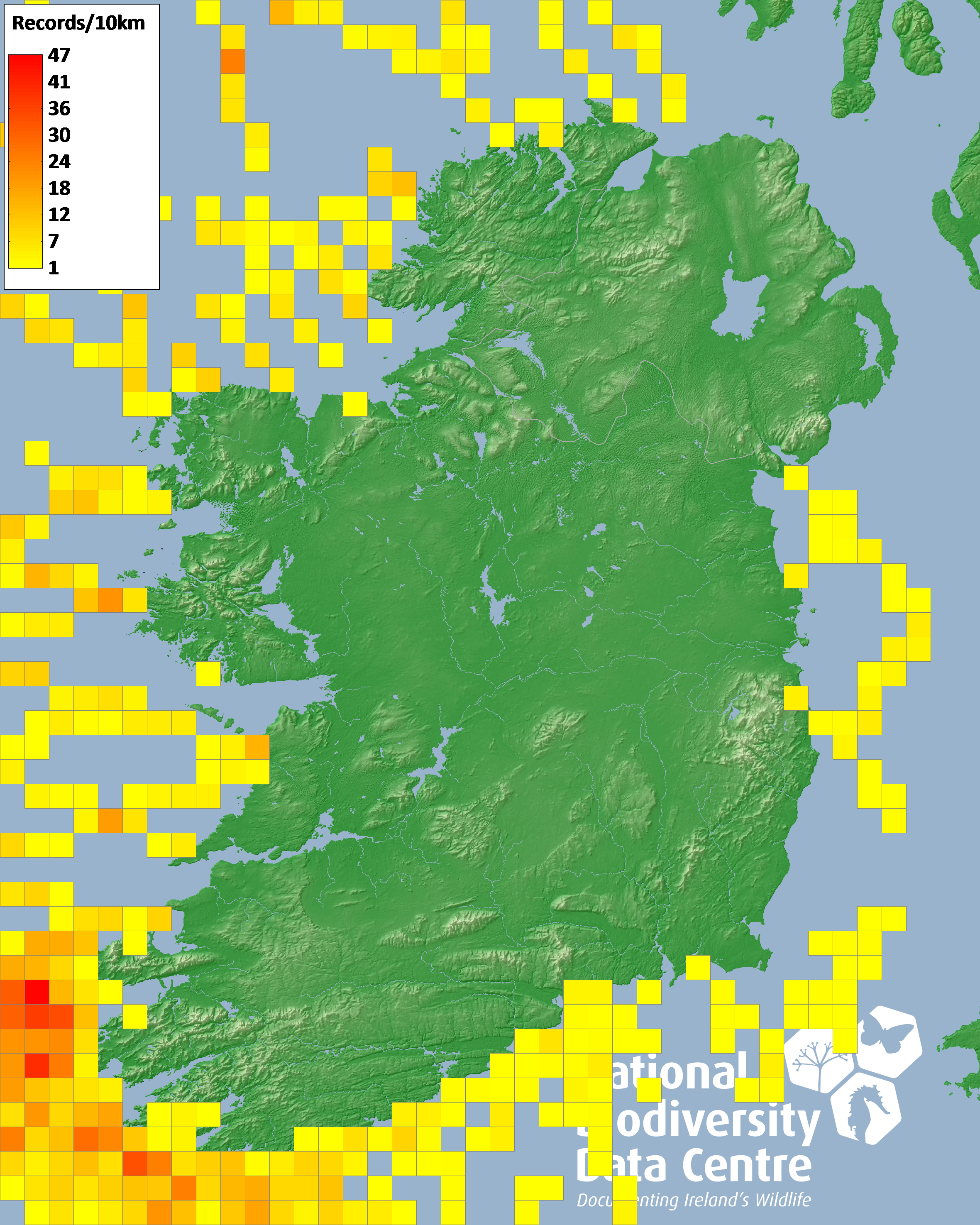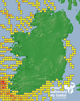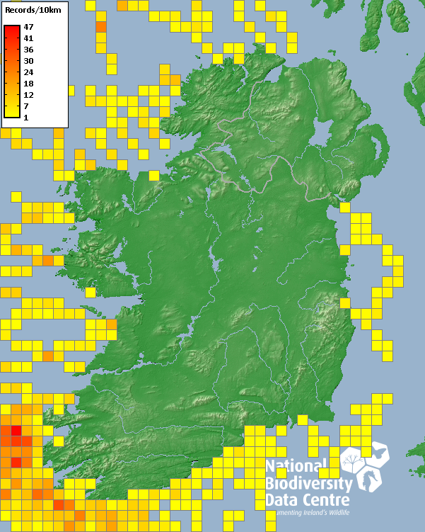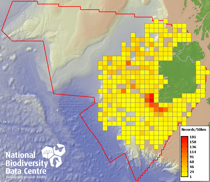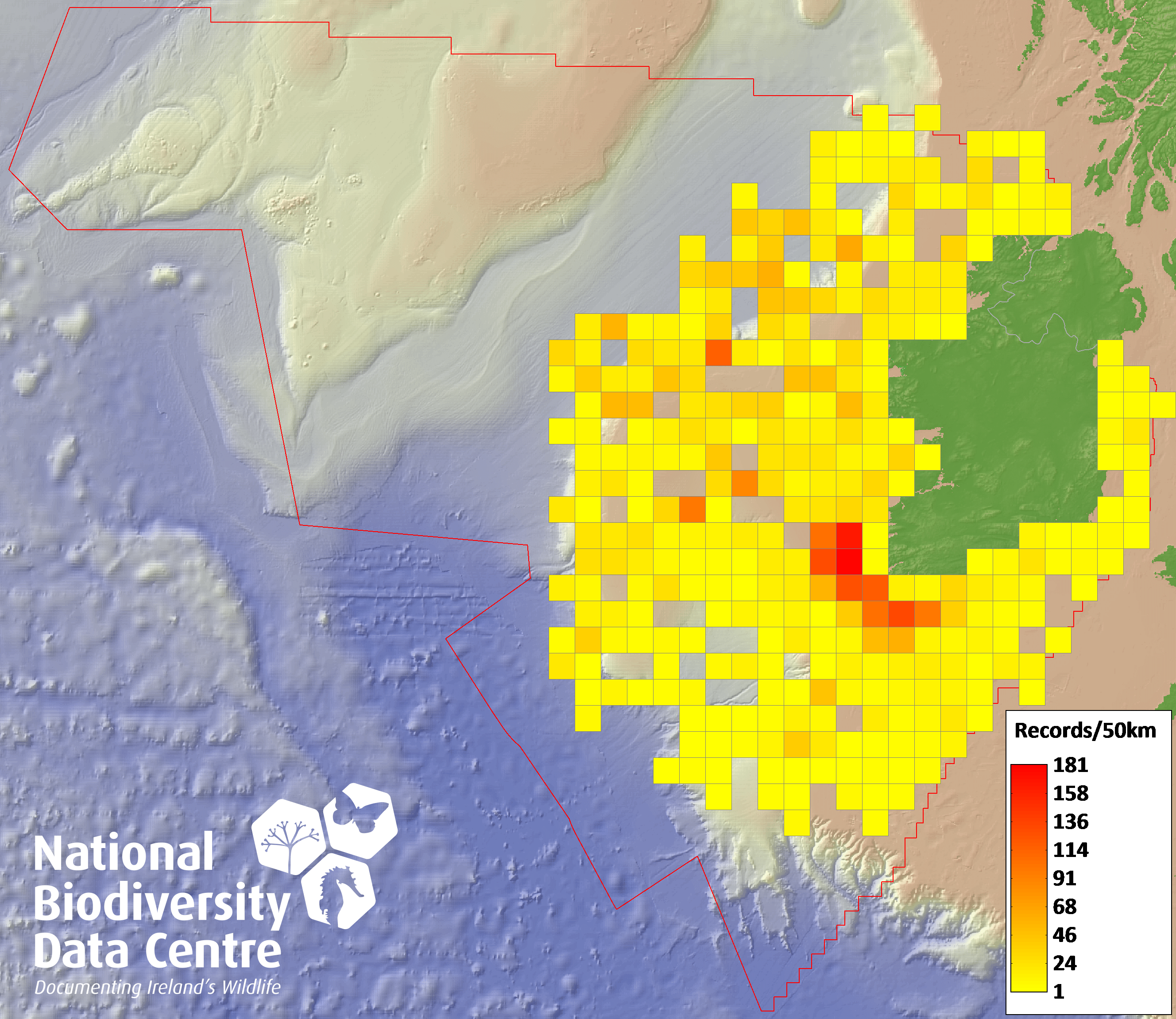 Distribution of the number of records recorded within each 10km grid square (ITM).Marine Map - 50km