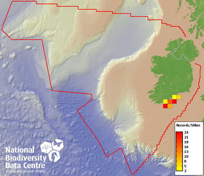 Distribution of the number of records recorded within each 10km grid square (ITM).Marine Map - 50km