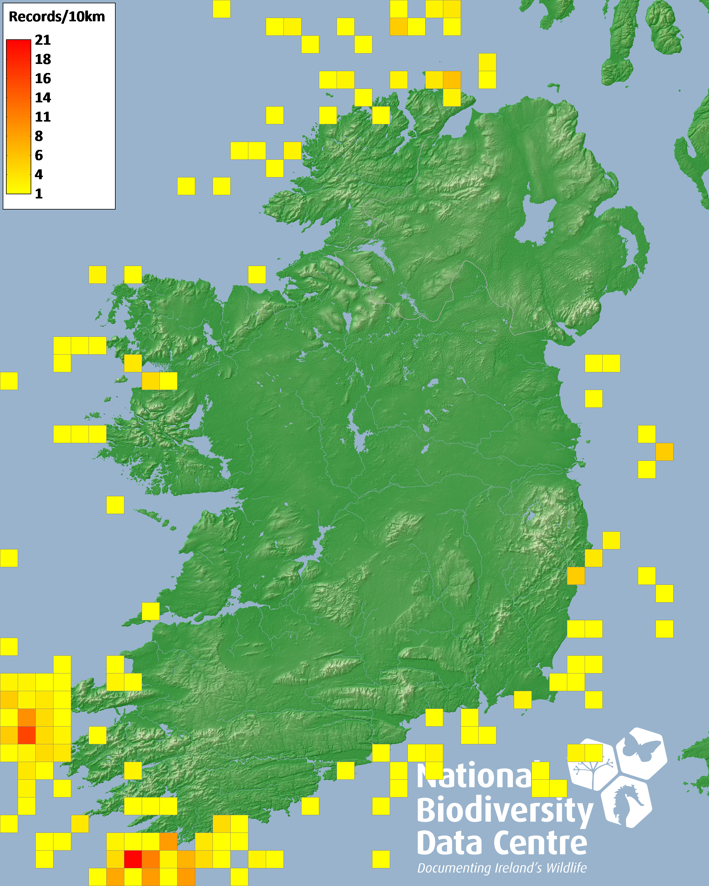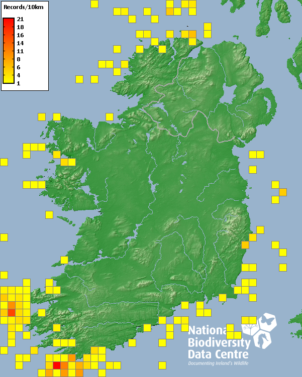 Distribution of the number of records recorded within each 10km grid square (ITM).Marine Map - 50km
