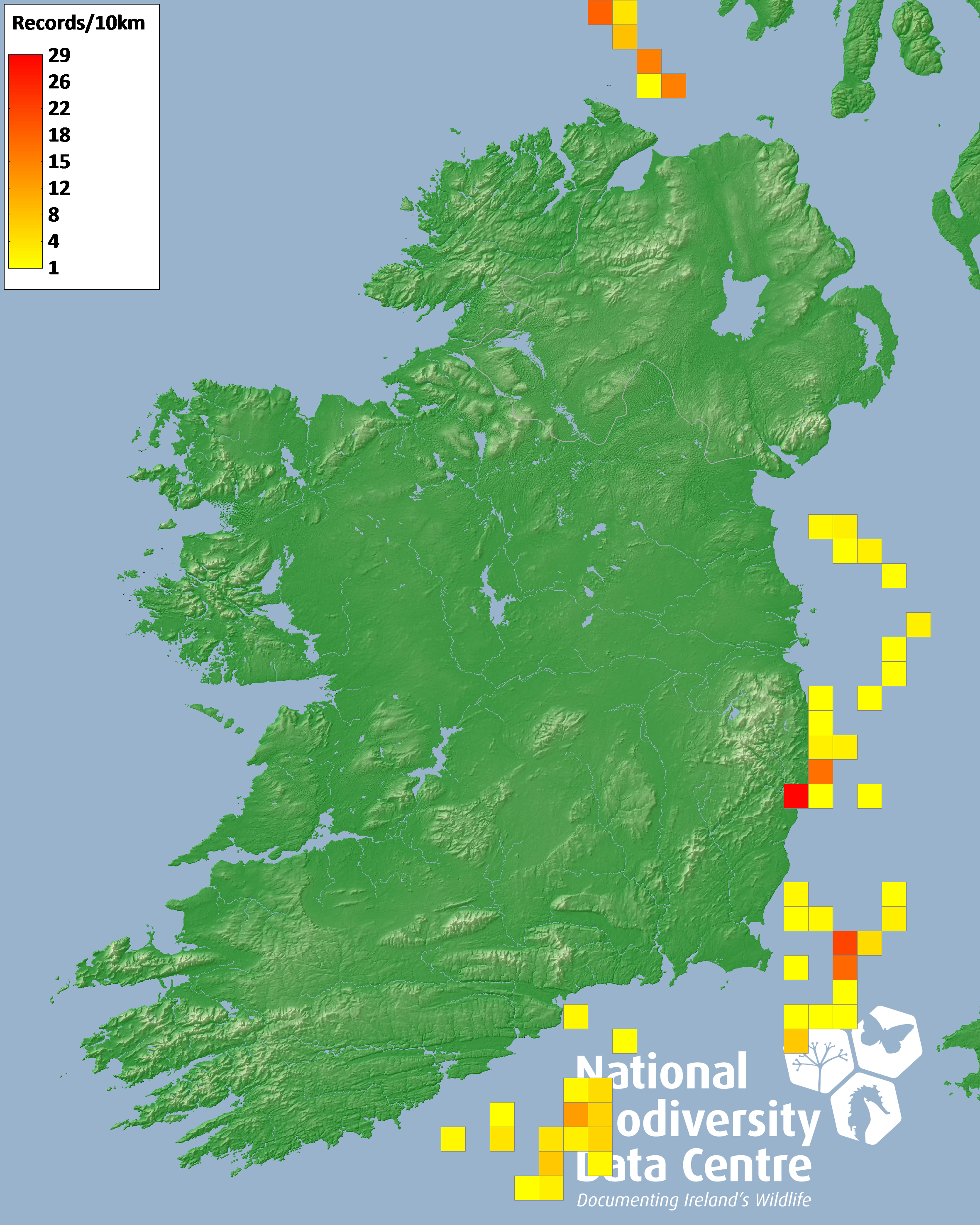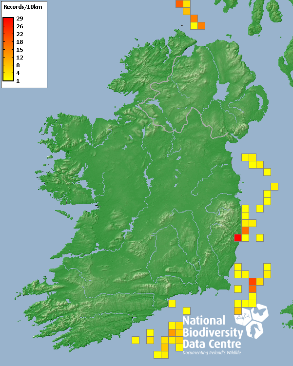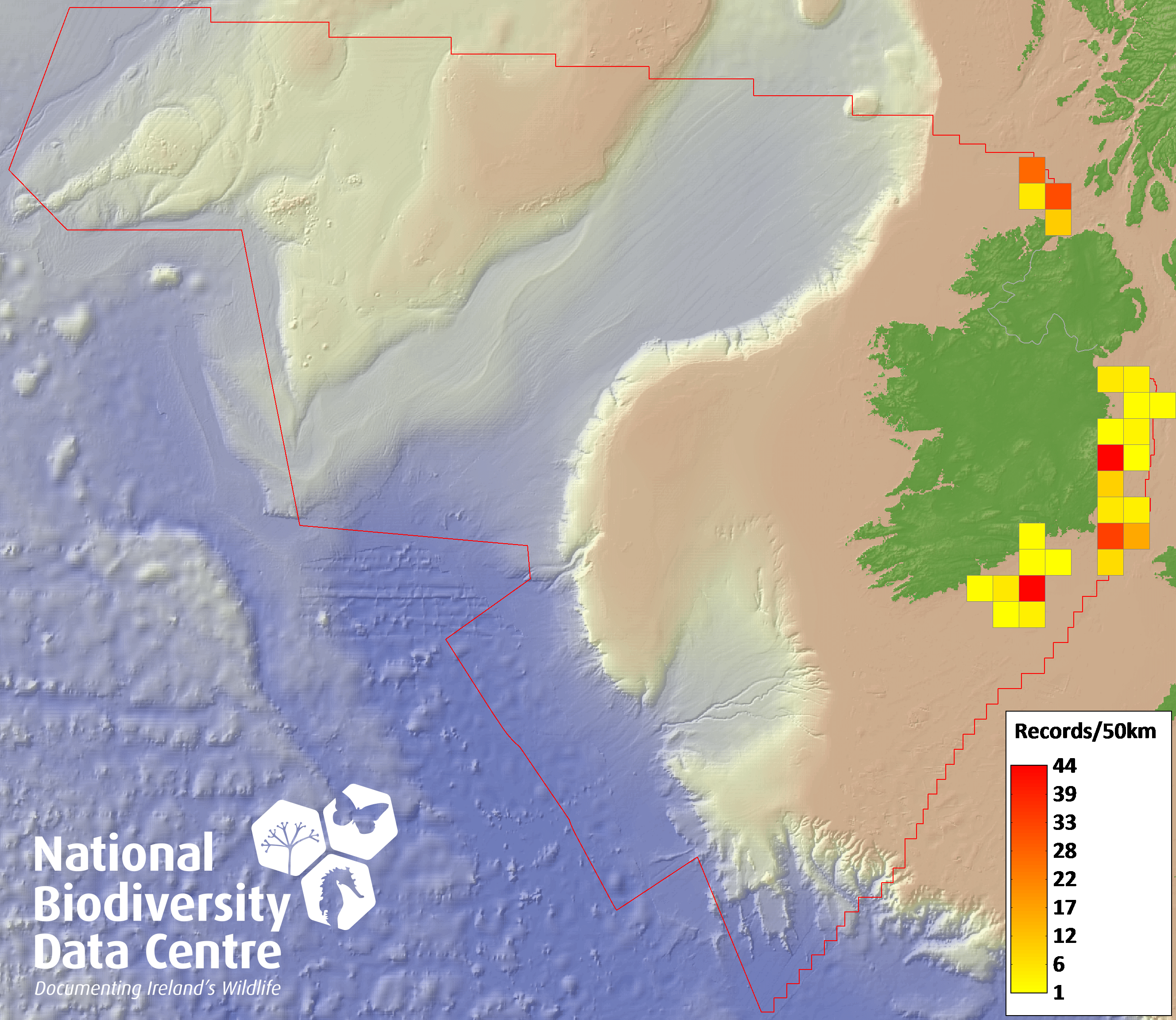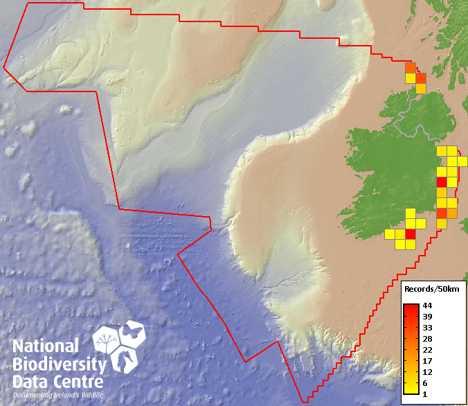 Distribution of the number of records recorded within each 10km grid square (ITM).Marine Map - 50km