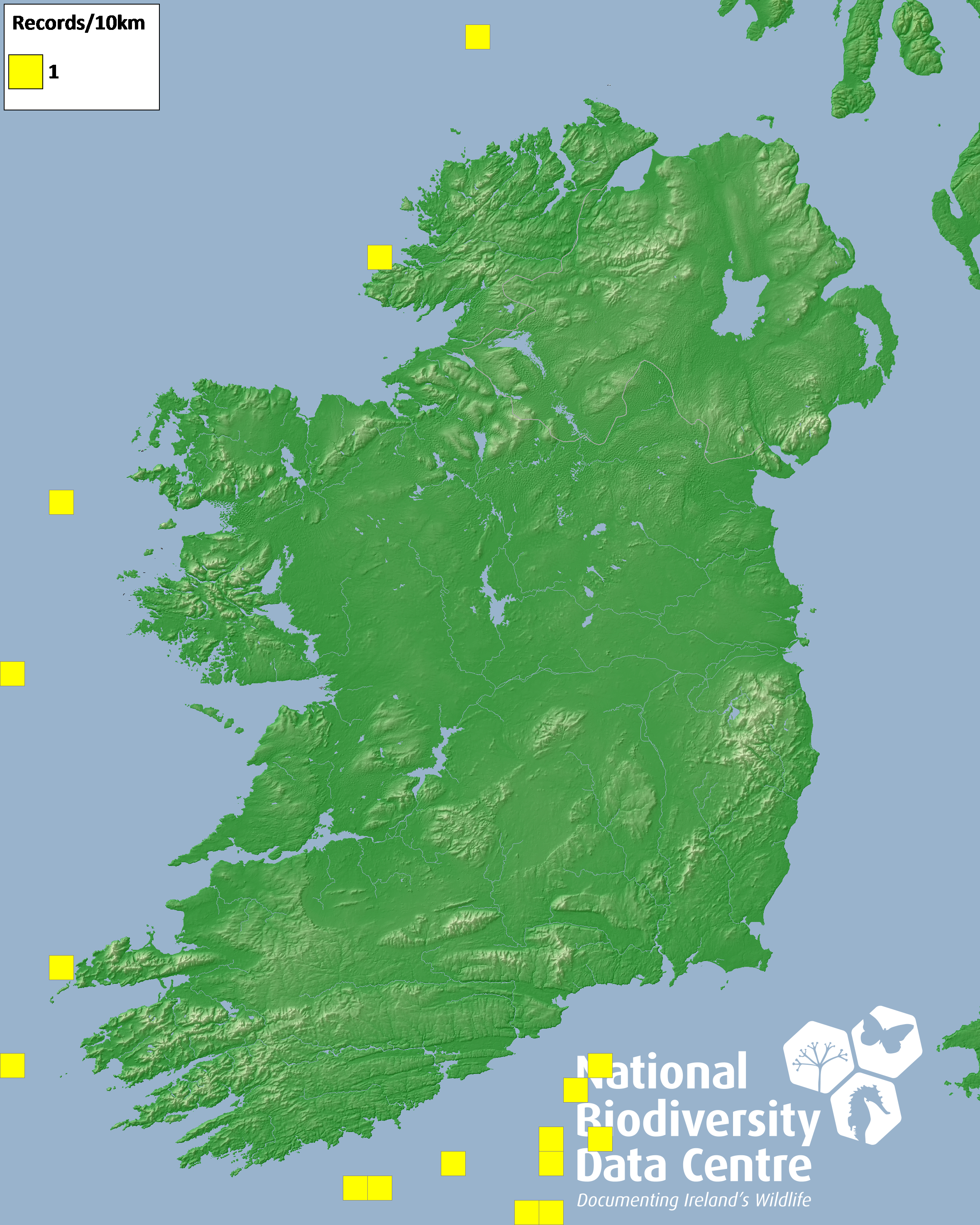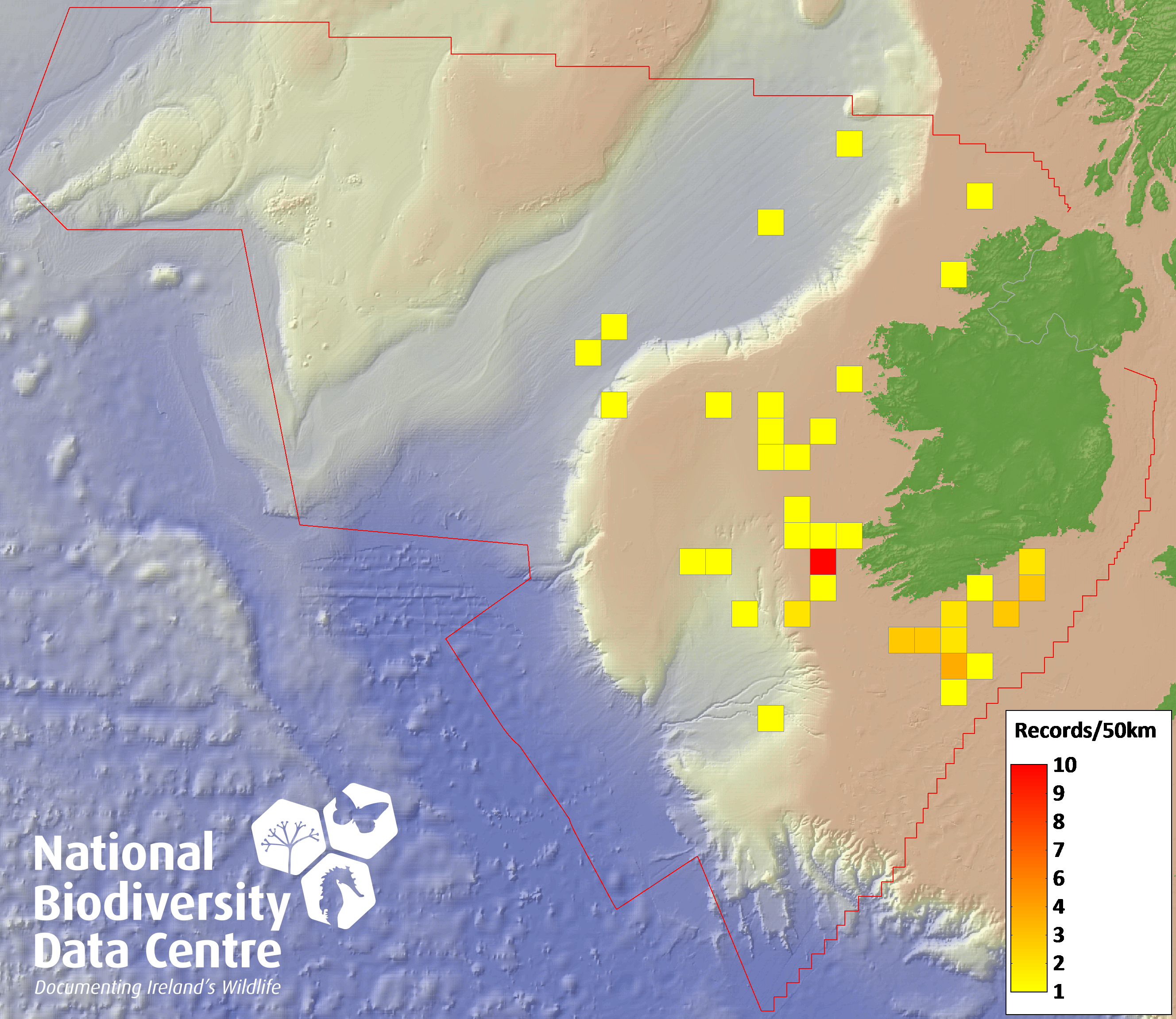 Distribution of the number of records recorded within each 10km grid square (ITM).Marine Map - 50km