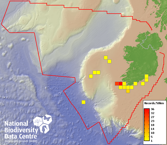 Distribution of the number of records recorded within each 10km grid square (ITM).Marine Map - 50km