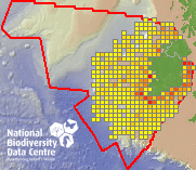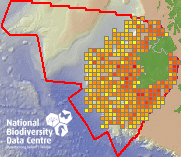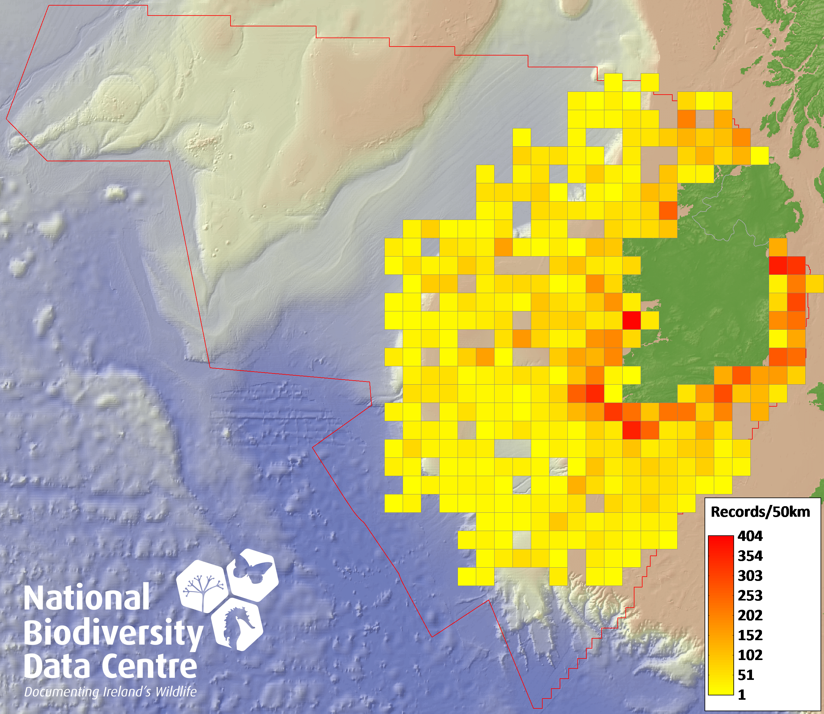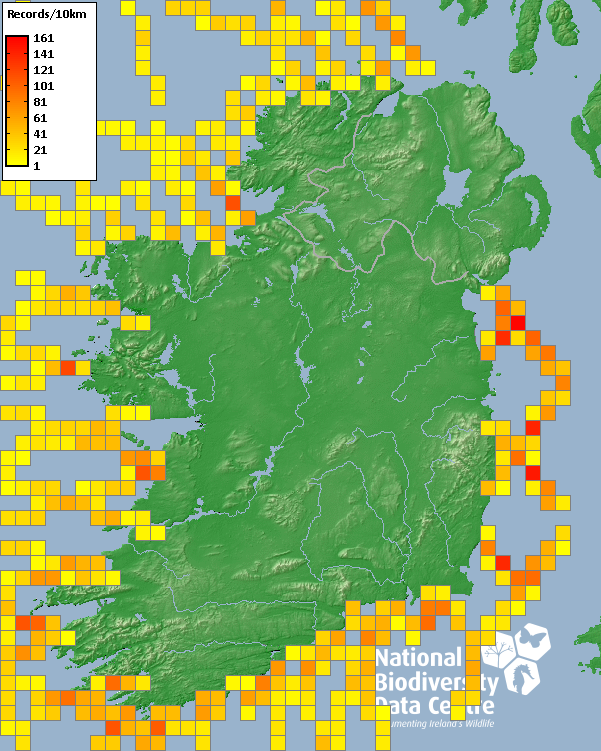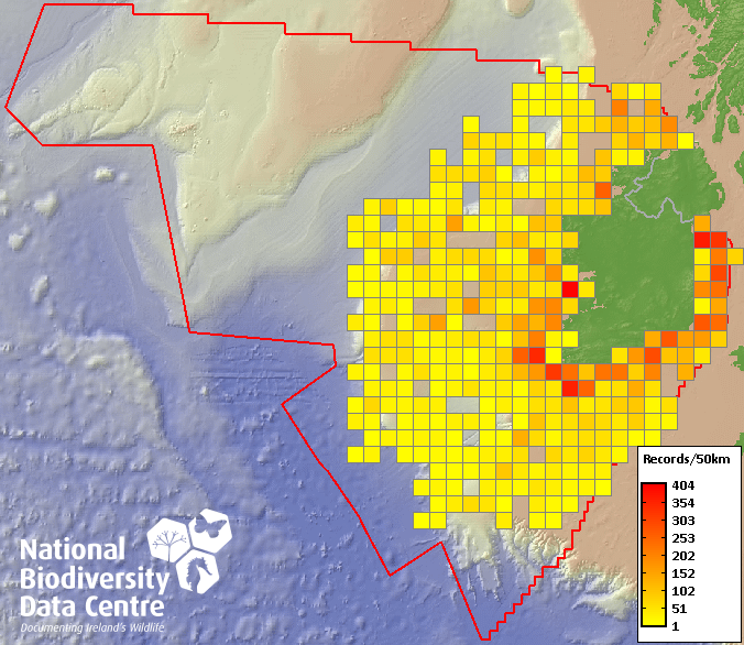 Distribution of the number of records within each 10km grid square (ITM).Marine Map - 50Km