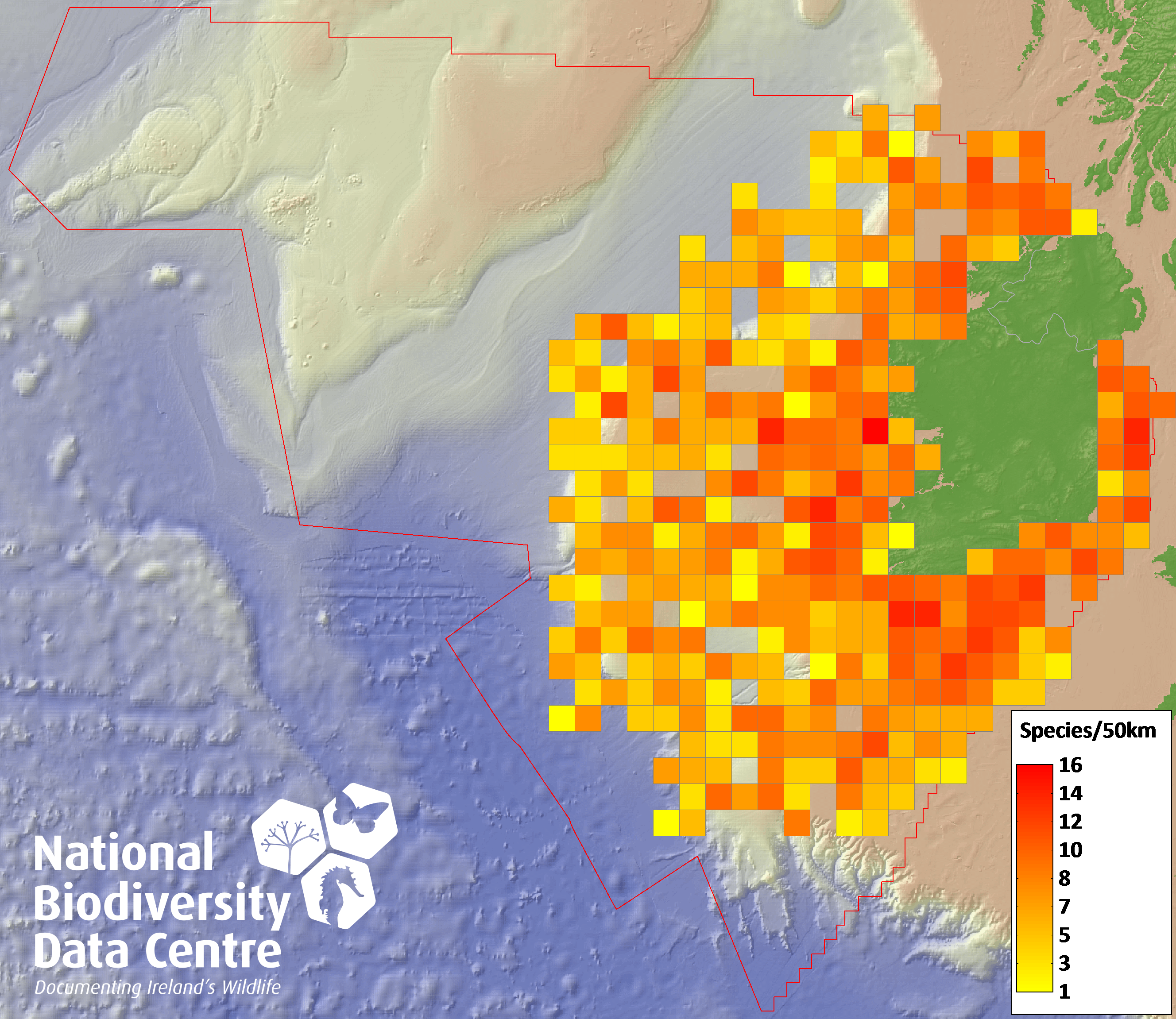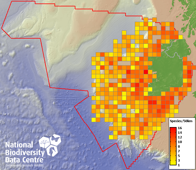 Distribution of the number of species recorded within each 10km grid square (ITM).Marine Map - 50Km
