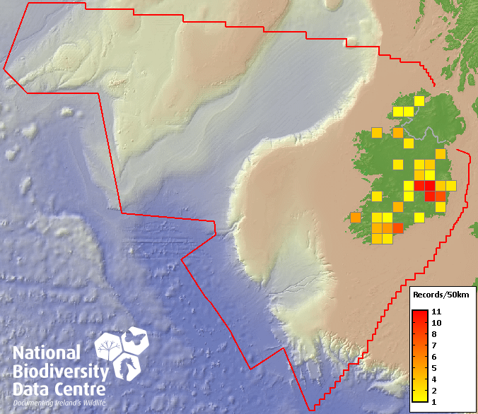 Distribution of the number of records recorded within each 10km grid square (ITM).Marine Map - 50km