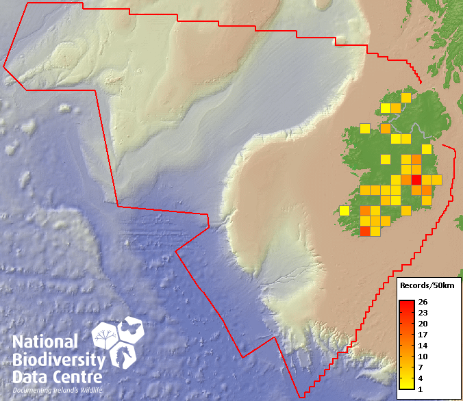 Distribution of the number of records recorded within each 10km grid square (ITM).Marine Map - 50km