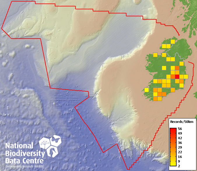 Distribution of the number of records recorded within each 10km grid square (ITM).Marine Map - 50km