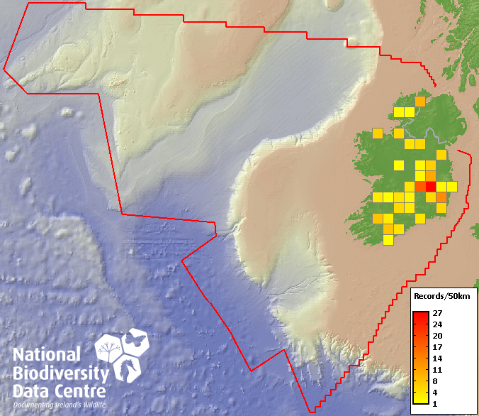 Distribution of the number of records recorded within each 10km grid square (ITM).Marine Map - 50km