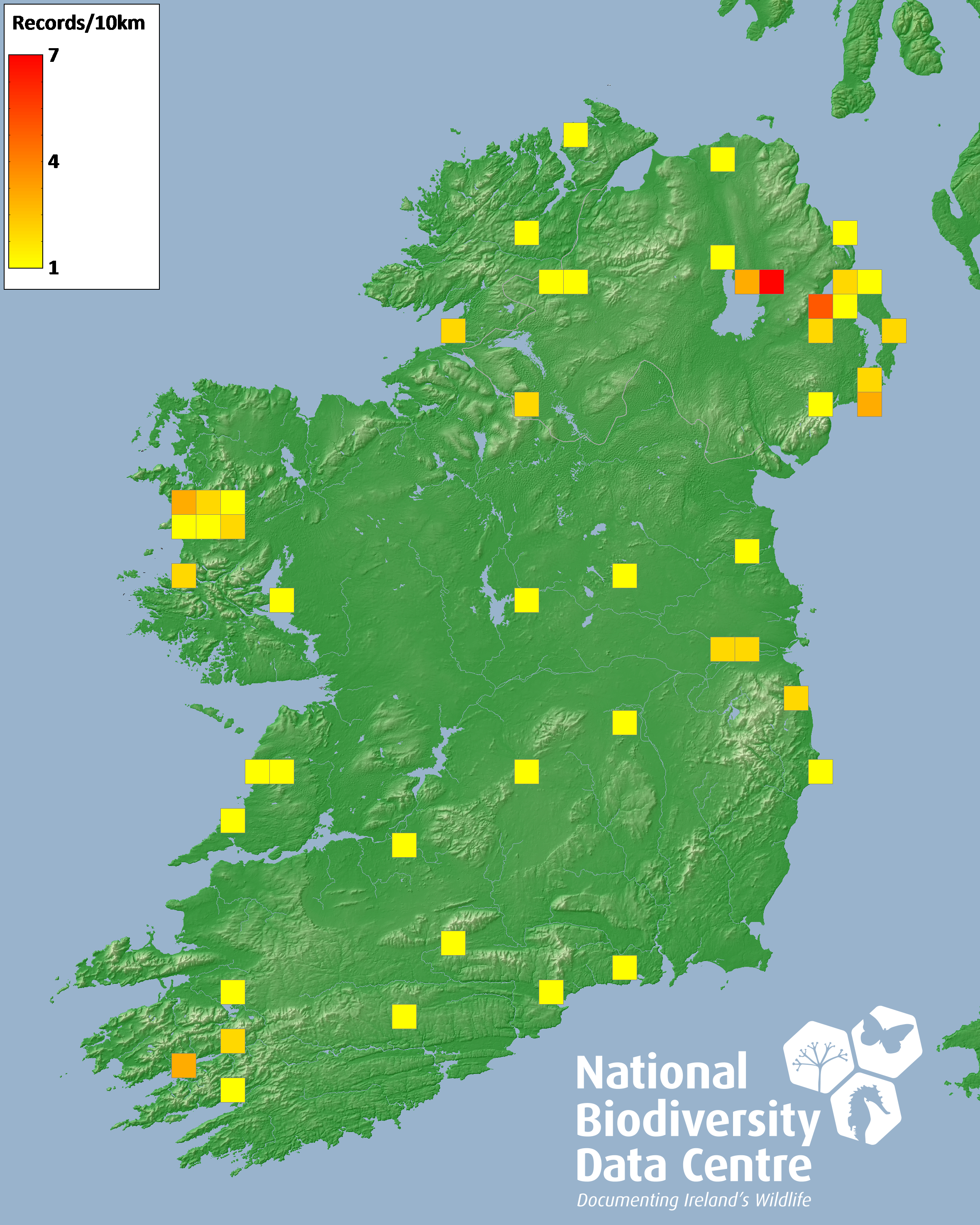 Distribution of the number of records recorded within each 10km grid square (ITM).Marine Map - 50km
