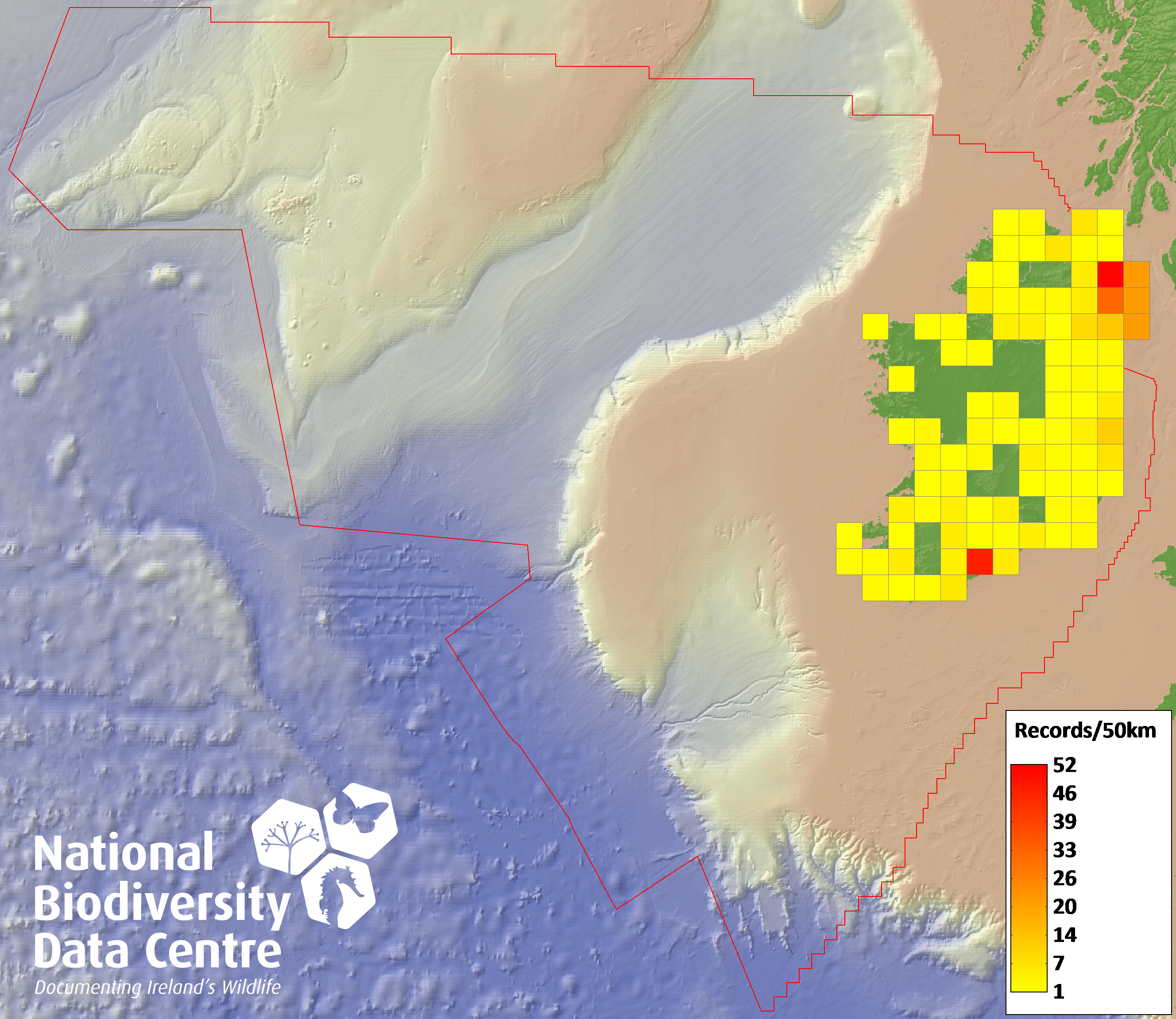 Distribution of the number of records recorded within each 10km grid square (ITM).Marine Map - 50km