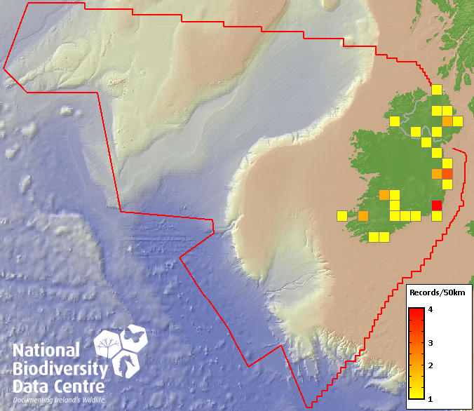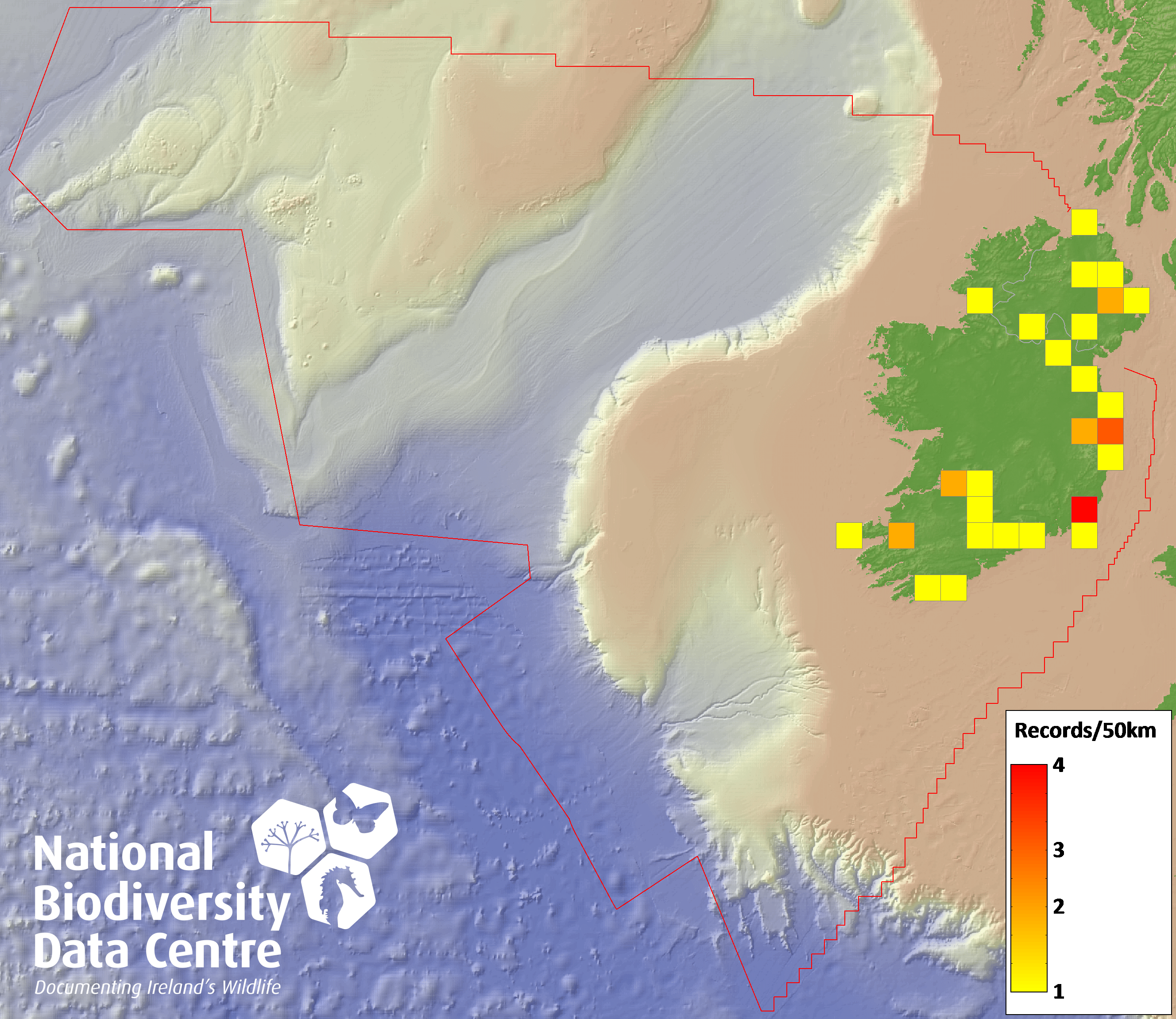 Distribution of the number of records recorded within each 10km grid square (ITM).Marine Map - 50km