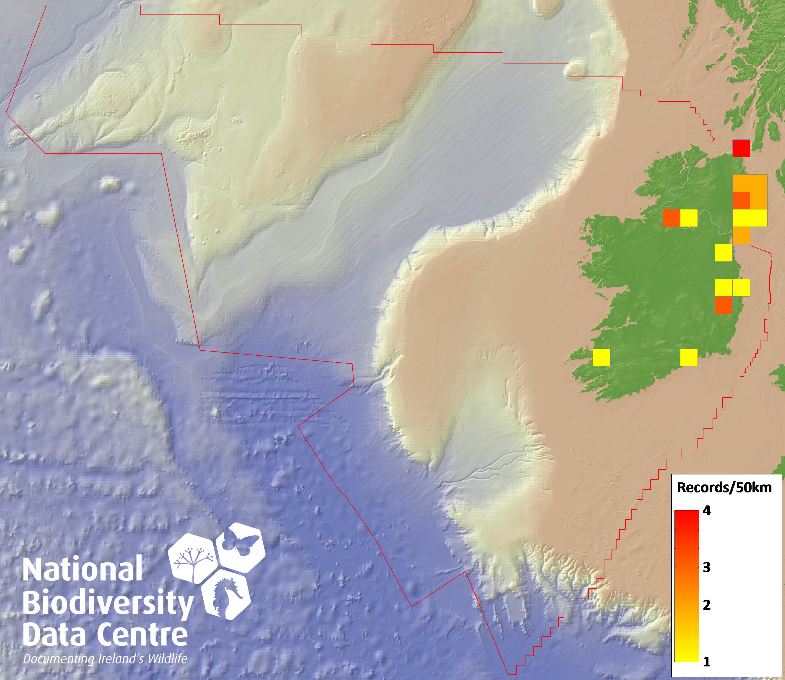 Distribution of the number of records recorded within each 10km grid square (ITM).Marine Map - 50km