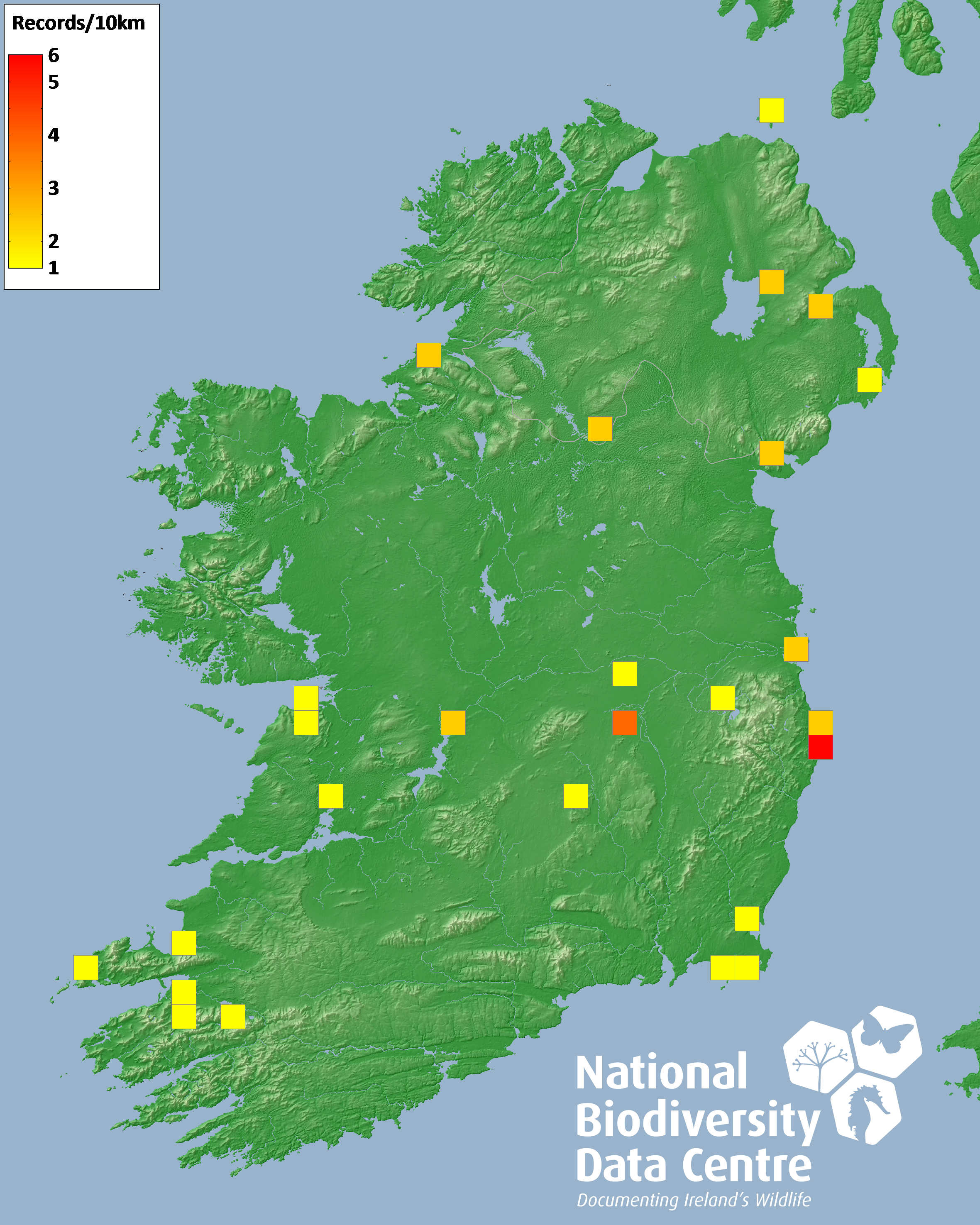 Distribution of the number of records recorded within each 10km grid square (ITM).Marine Map - 50km