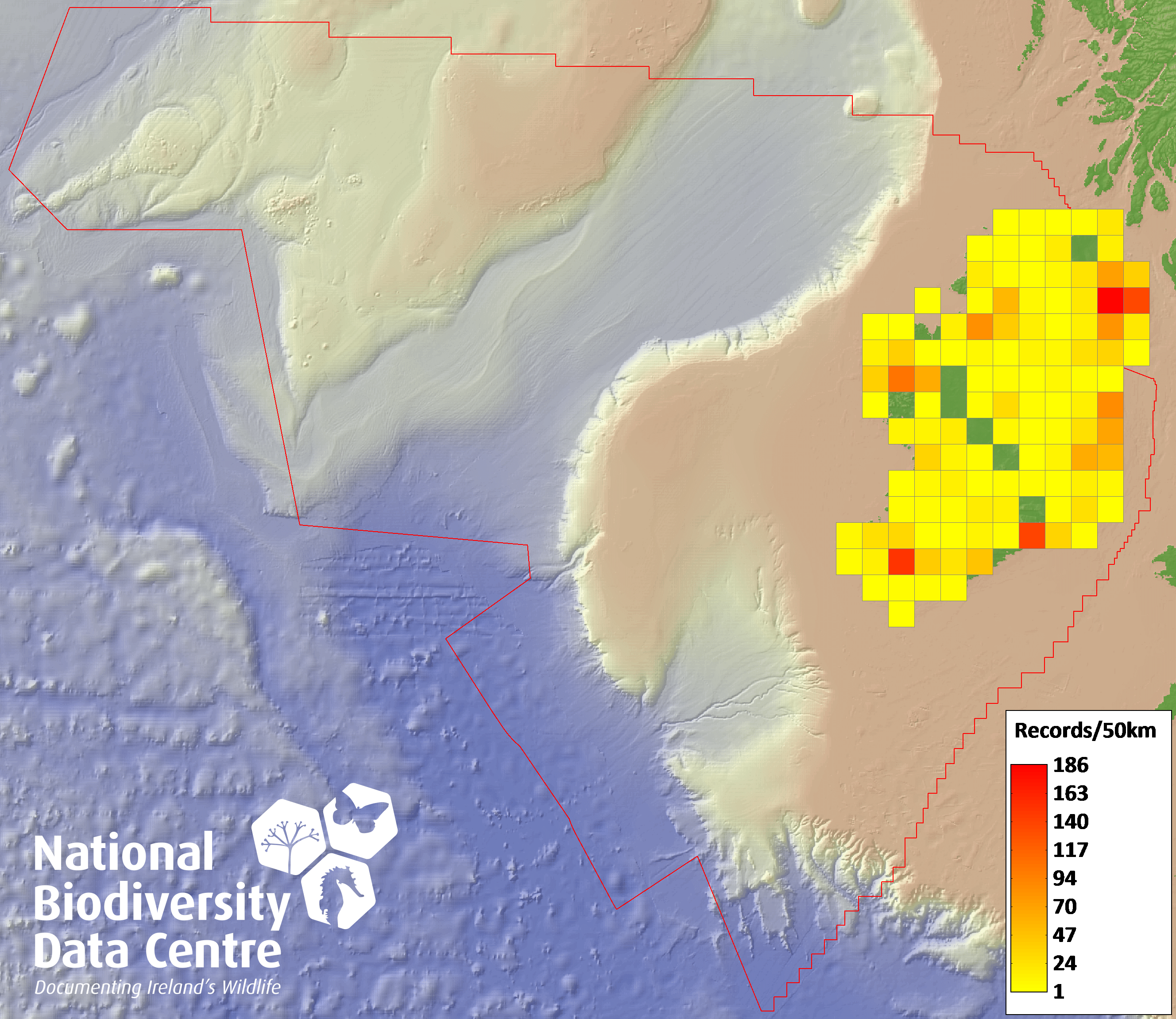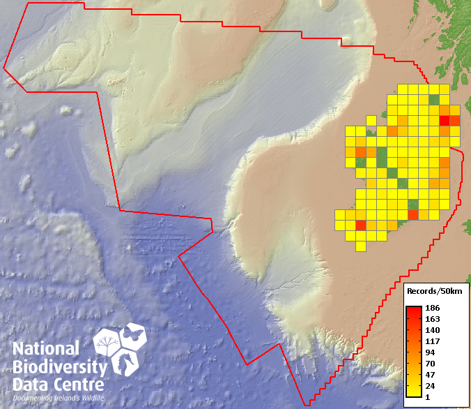 Distribution of the number of records within each 10km grid square (ITM).Marine Map - 50Km
