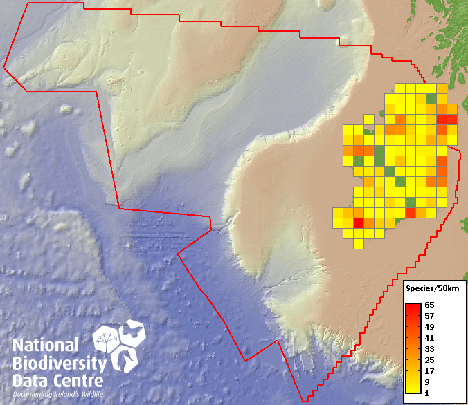 Distribution of the number of species recorded within each 10km grid square (ITM).Marine Map - 50Km