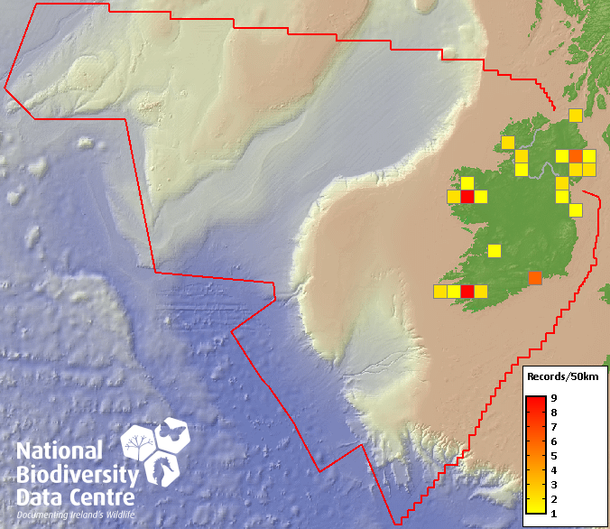 Distribution of the number of records recorded within each 10km grid square (ITM).Marine Map - 50km