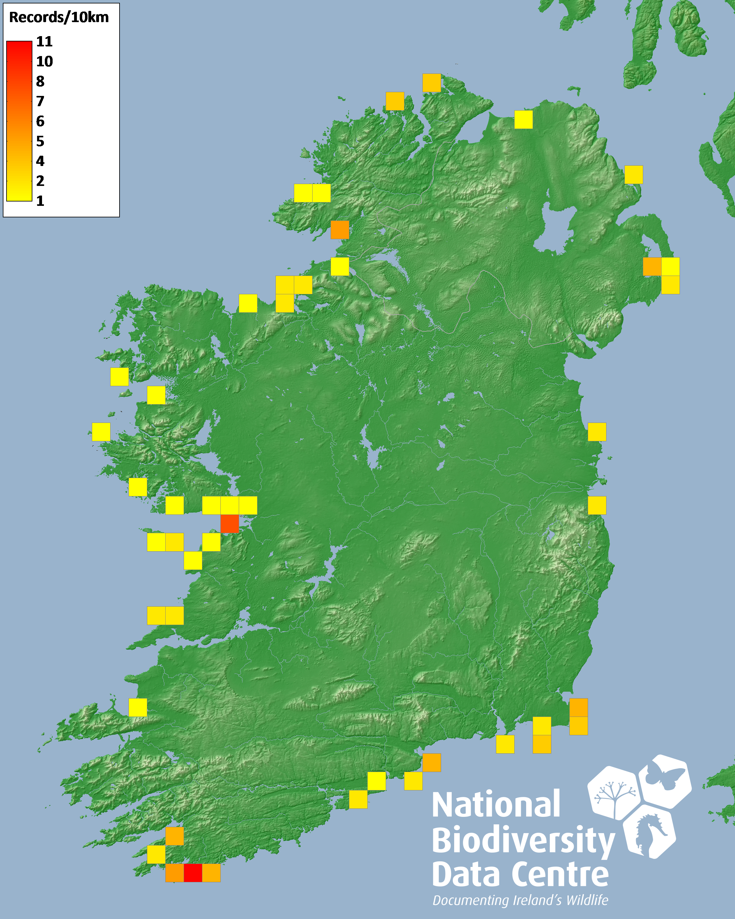Distribution of the number of records recorded within each 10km grid square (ITM).Marine Map - 50km